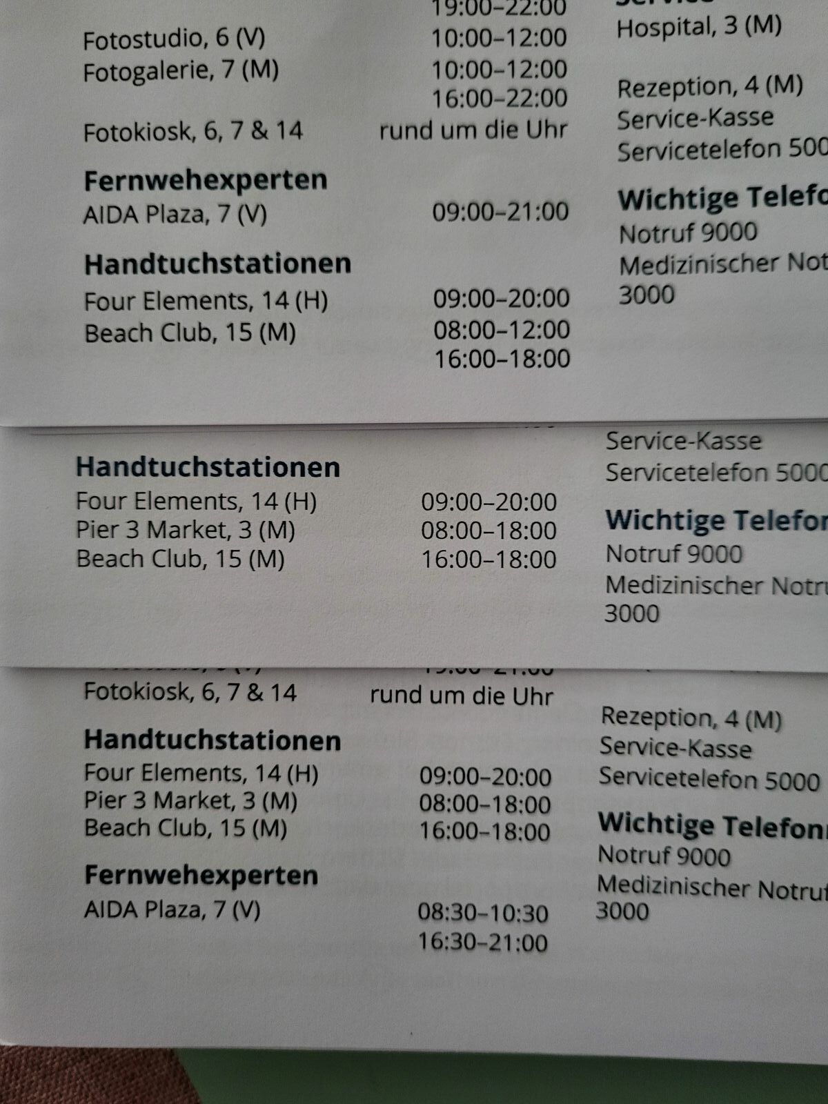Und auch das habe ich schon mal gesagt: Egal wie wenig Gewicht, wie klein gefaltet, ich habe es immer genossen, auf eine Aida-Reise nicht auch noch eigene Handtücher mitzuschleppen. Und bei Tagespreisen von manchmal 200 oder 300 € ist das 2. Handtuch seitens des Gastgebers auch nicht nur (siehe oben) ein bloßer Service, den man durchaus erwarten kann.