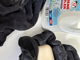 Ich habe 2 identische Mikrofaserhandtücher vorgewaschen, auf der Leine getrocknet und beschmutzt. (Ich habe vorher ein wenig in der Erde gewühlt, mir die Hände an den Handtüchern trocken abgerieben, die Hände gewaschen und abgetrocknet, jeweils 1 EL Duschgel, 50ml Wasser und 5 Pumpstösse Sonnencreme auf den Handtüchern verteilt. Gerade „bebrüten“ sie ein wenig. Morgen, oder am Montag werde ich jeweils ein Handtuch im Waschbecken mit Kernseife und das andere mit Hygienespüler nach Vorschrift in der Maschine waschen. Danach werden sie wieder an der Leine getrocknet und ich werde Proben nehmen und diese auf Bakterien untersuchen.