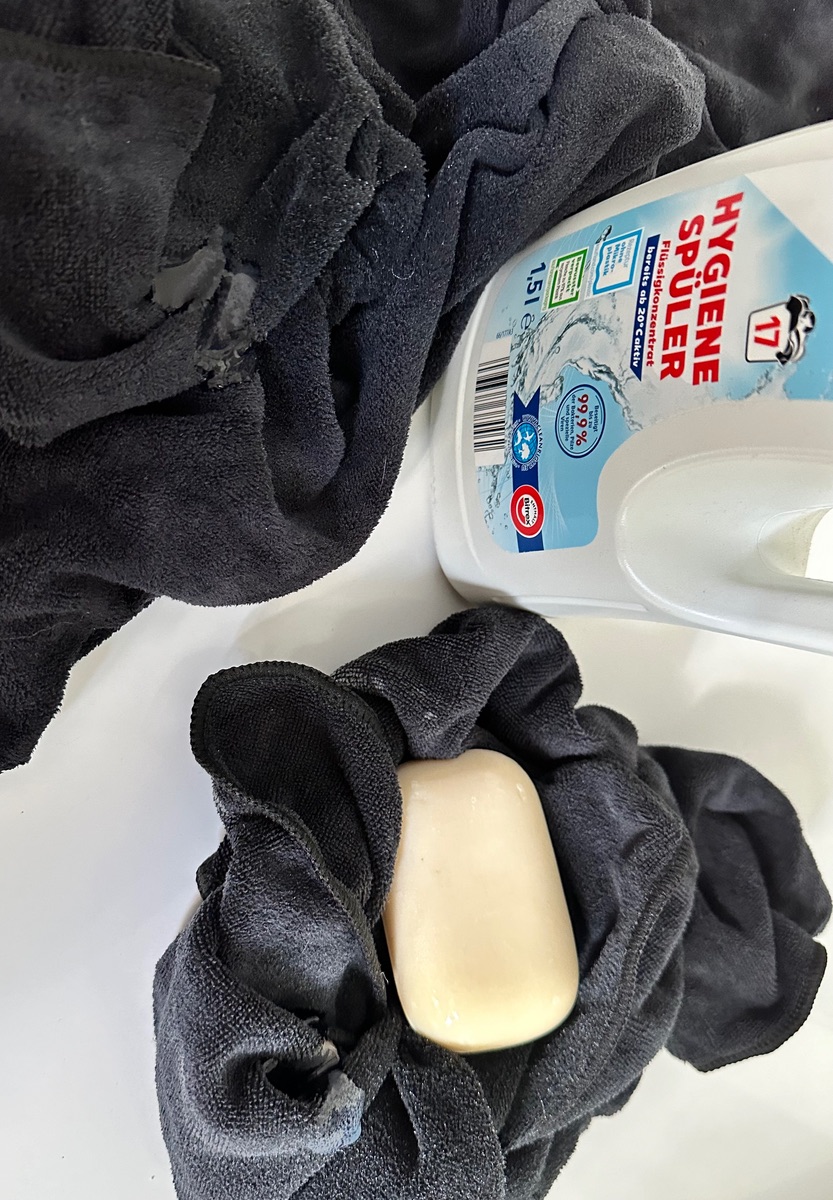 Ich habe 2 identische Mikrofaserhandtücher vorgewaschen, auf der Leine getrocknet und beschmutzt. (Ich habe vorher ein wenig in der Erde gewühlt, mir die Hände an den Handtüchern trocken abgerieben, die Hände gewaschen und abgetrocknet, jeweils 1 EL Duschgel, 50ml Wasser und 5 Pumpstösse Sonnencreme auf den Handtüchern verteilt. Gerade „bebrüten“ sie ein wenig. Morgen, oder am Montag werde ich jeweils ein Handtuch im Waschbecken mit Kernseife und das andere mit Hygienespüler nach Vorschrift in der Maschine waschen. Danach werden sie wieder an der Leine getrocknet und ich werde Proben nehmen und diese auf Bakterien untersuchen.