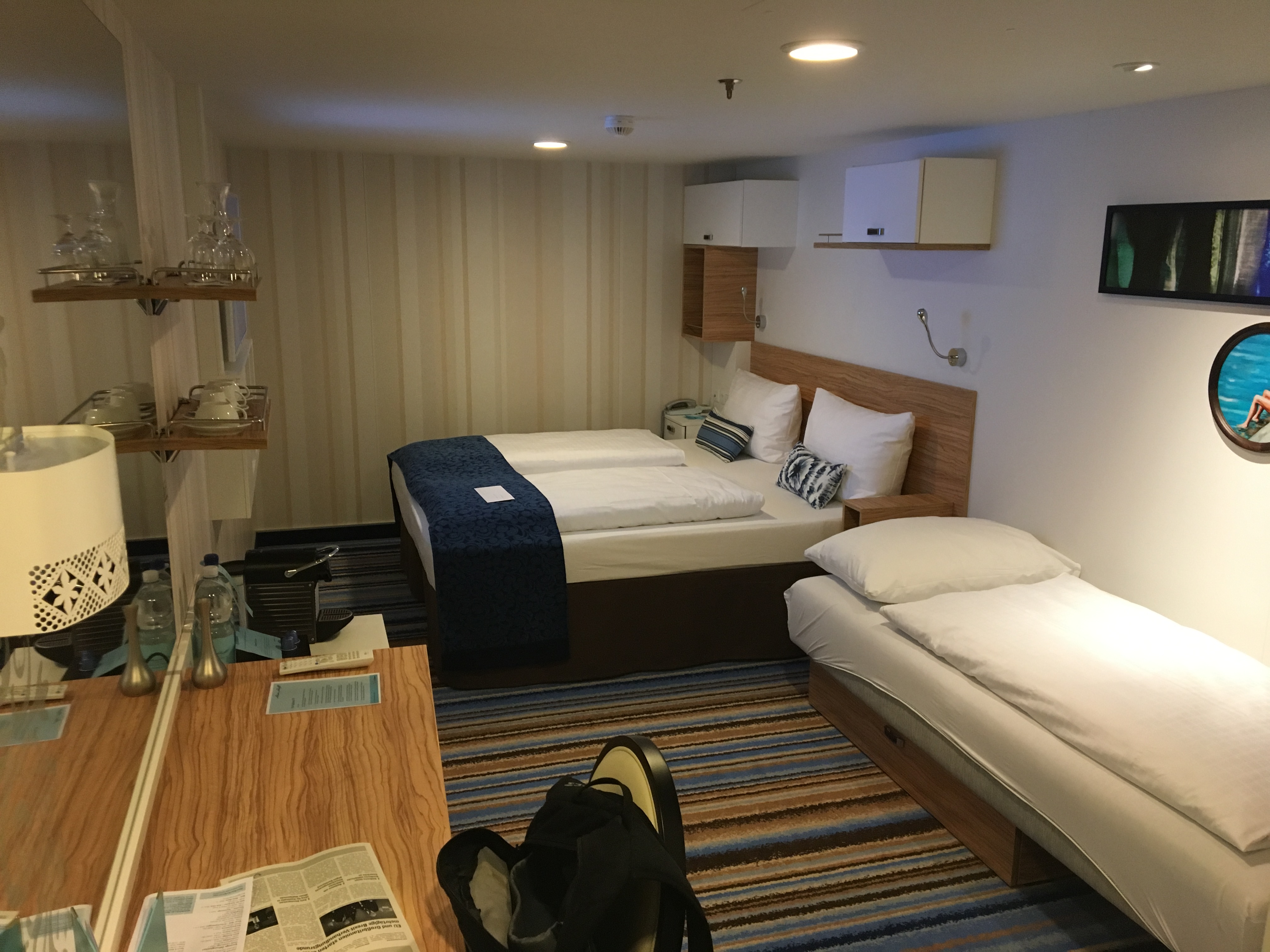 Wir bewohnten diese Kabine auf der MS6 für 8 Nächte. Diese Innenkabine befindet sehr weit vorne und hat einen eigenen Quergang. Die Betten sind bequem.