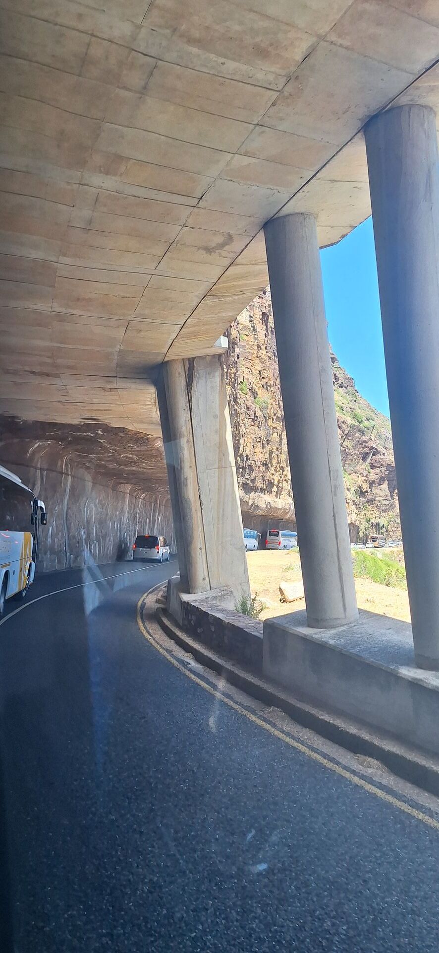 Was mich wirklich beeindruckt hat war die Fahrt durch das Chapmans Peak Reservat die Busse fahren durch einen Halbtunnel, oder eine Kerbe die in den Berg geschlagen wurde. Habe ich noch nie gesehen , verrückt! dort sieht man die Busse aus der Entfernung.