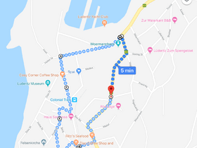 Den Ort zu Fuß zu erkunden sollte man nicht auslassen. Nur so entdeckt man die zahlreichen "Überbleibsel" aus der Kolonialisierung, die teilweise auch restauriert wurden (wie man an den kräftigen Farben sieht). Hier auf Google Maps findest du die Fußgängerroute, die wir in etwa gelaufen sind (2 km). Wir beginnen in etwa auf Höhe des Restaurants "Essenzeit" beim Hafen und laufen von der Hafen St. in die B4. Dabei entdecken wir bereits die Lesehalle und Turnhalle, welche heute tatsächlich noch als Bücherei und Turnhalle/ Veranstaltungssaal dienen. Die Farbenvielfalt ist beeindruckend und man kann davon ausgehen, dass der Anstrich restauriert wurde. Wir folgen der Straße in der Kurve nach rechts und gelangen an der anschließenden Kreuzung zum "Kapps Konzert und Ballsaal" und der angrenzenden "Kegelbahn". Dort gehen wir nun links weiter und kurze Zeit später in die "Lessing St". Ein wenig weiter stößt man auf das "Krabbenhöft & Lampe" Gebäude, welches äußerlich aber nicht weiter spannend ist. Von dort aus kann man kurz nach links weiter und in die "Bulow St" abbiegen. Dort geht es ein wenig den Berg hoch, aber es bietet sich kurze Zeit später auch eine tolle Aussicht auf Lüderitz. Ganz oben befindet sich nun auch das bekannte Goerke Haus, Wohnhaus des ehemaligen Leutnants Hans Goerke. Wenn man auch hinein möchte, muss man 25 ND (ca. 1,60 €) Eintritt bezahlen. Geöffnet ist werktags allerdings nur von 14-16 Uhr und am Wochenende von 16-17 Uhr. Wir sahen uns das Haus nur von außen an. Bereits von dort hat man eine schöne Aussicht. Wer noch mehr Überblick haben möchte, kann aber auch auf den dahinter liegenden "Diamantberg" kraxeln. Vom Goerke Haus gehen wir in die "Diamant St" und dann rechts in die "Kirch St". Wenn man möchte kann man an der Kreuzung auch noch nach links direkt zur Kirche gehen. Wir gehen aber weiter und biegen links in die "Berg St". Dort befinden sich noch einmal sehr schöne, bunte Häuser mit deutschen Namen wie "Haus Eberleinz" oder "Schröderhaus". Nun geht's kurz rechts in die "Nachtigall St" und anschließend links wieder auf die Hauptstraße, die "Bismarck St". Dort passiert man den historischen Bahnhof von Lüderitz und anschließend die historische Bank aus der Kolonialzeit-der ersten Bank von Lüderitz. Den Abschluss der Tour (oder ggf. der Anfang) bildet dann noch das Woermannhaus. Insgesamt ein schöner, entspannter Spaziergang durch Lüderitz, auf dem man einiges sehen und lernen kann.