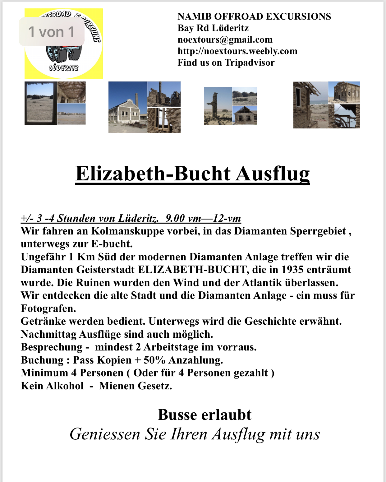 Wir werden nach Kolmanskop kommen und noch die Peninsula und Lüderitz Citytour machen.