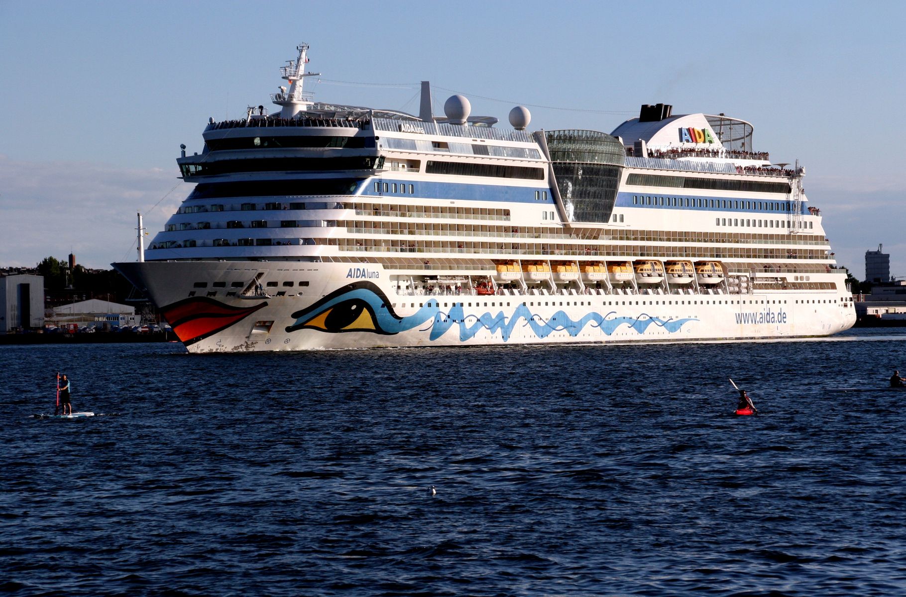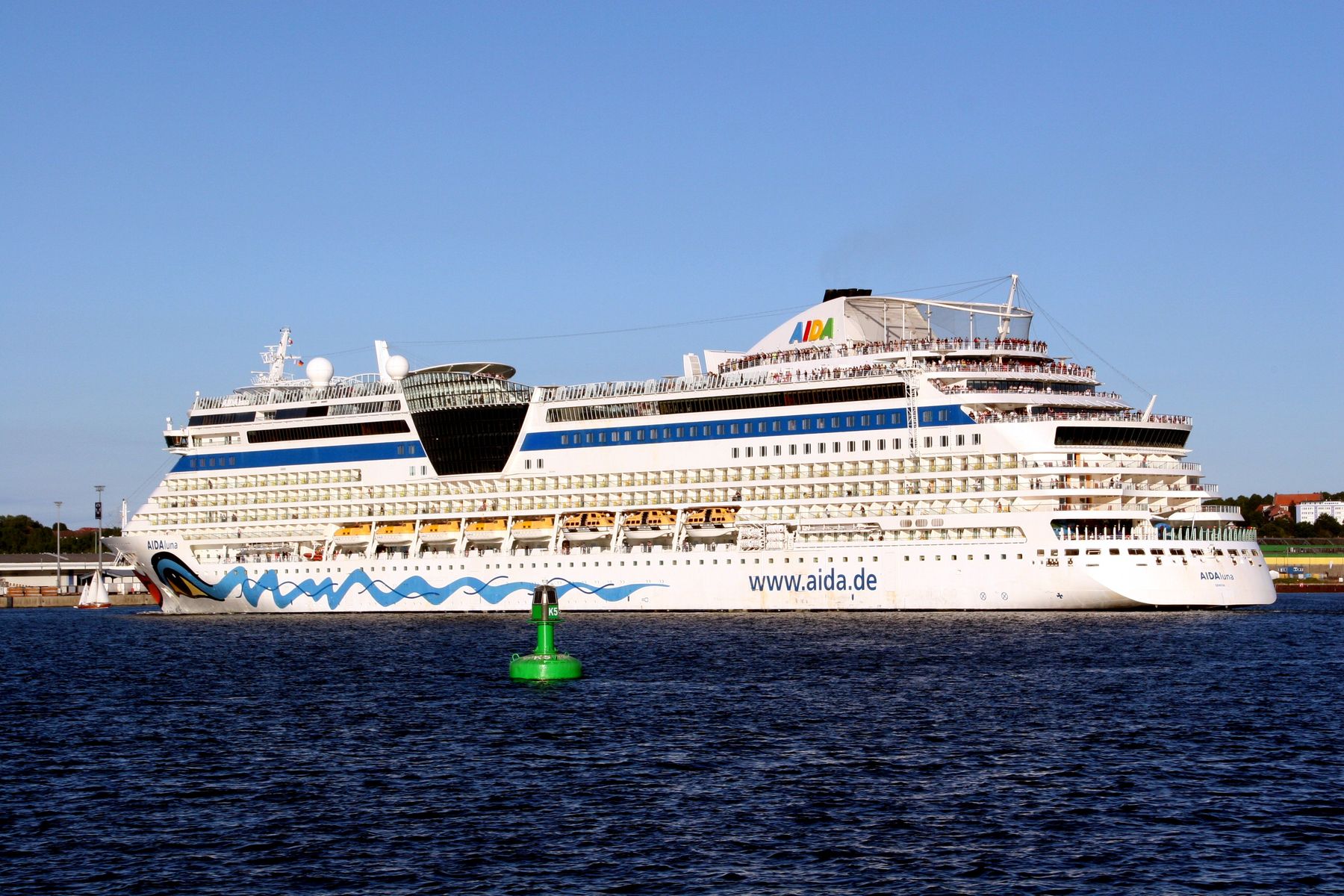 An Oberdeck genießen zahlreiche Passagiere ihre "Revierfahrt" mit der AIDAluna auf der "Kieler Förde"