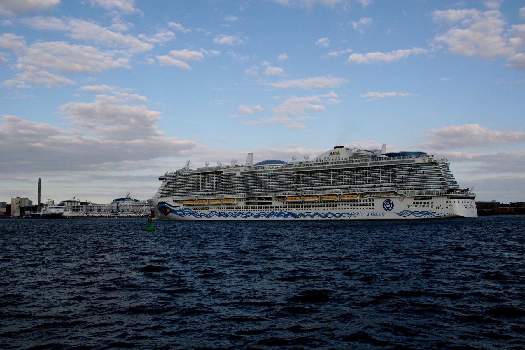 Die AIDAnova fährt am 03.09.2022 um 18:11h unter Schönwetterwolken ihr Auslaufmanöver auf der "Kieler Förde"