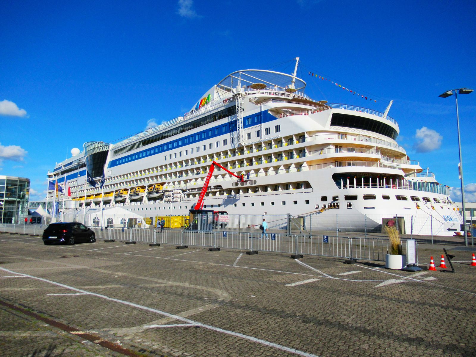 Die AIDAnova wartet am 14.10.2023 an ihrem "Liegeplatz 27" am Ostseekai unter einem azurblauen Himmel auf ihr Auslaufmanöver auf der "Kieler Förde"