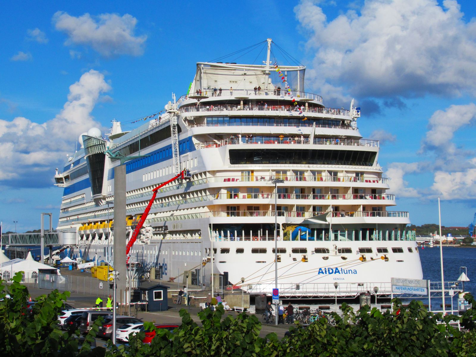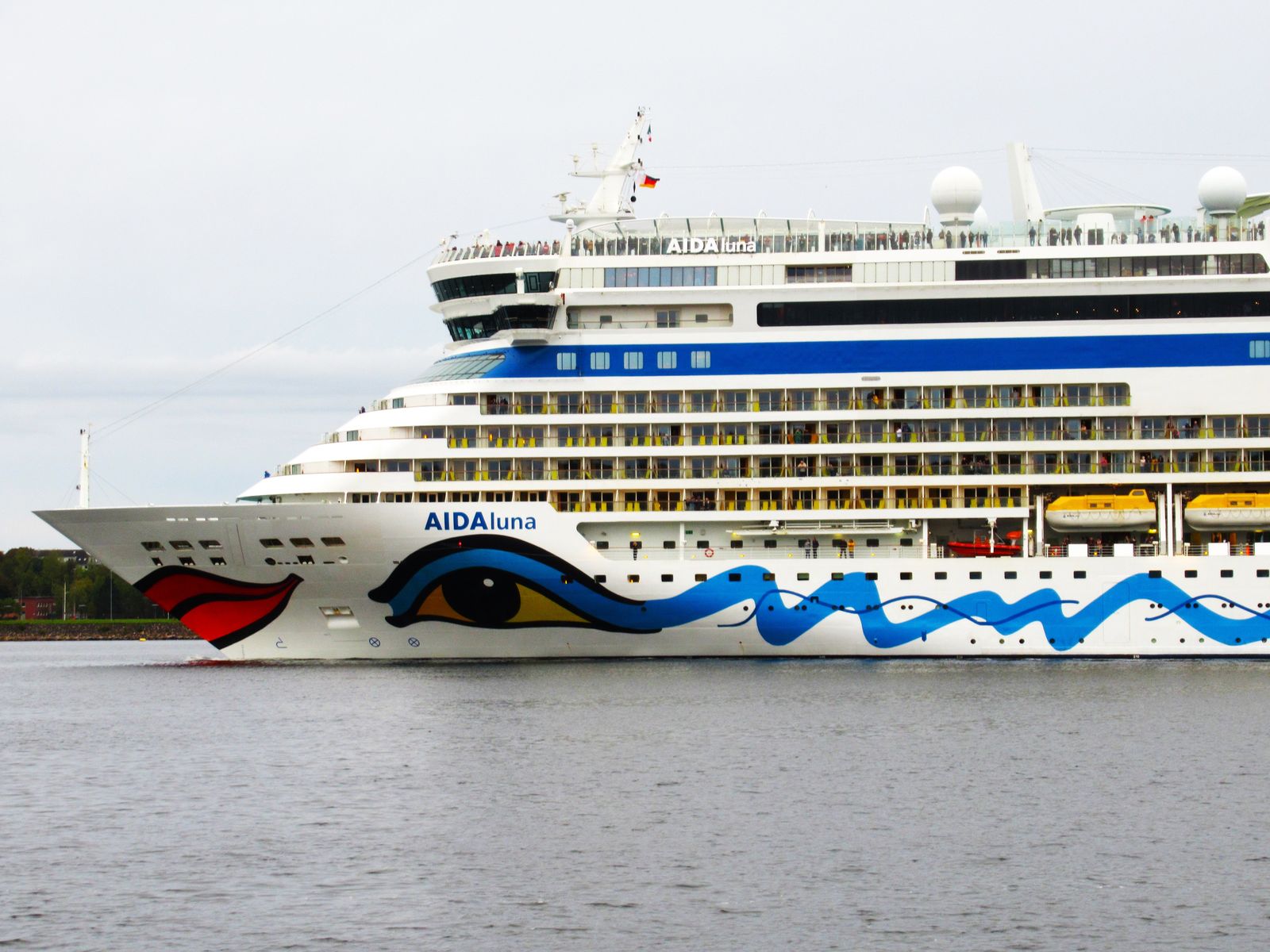 An Oberdeck genießen zahlreiche Passagiere ihre "Revierfahrt" mit der AIDAluna auf der "Kieler Förde"