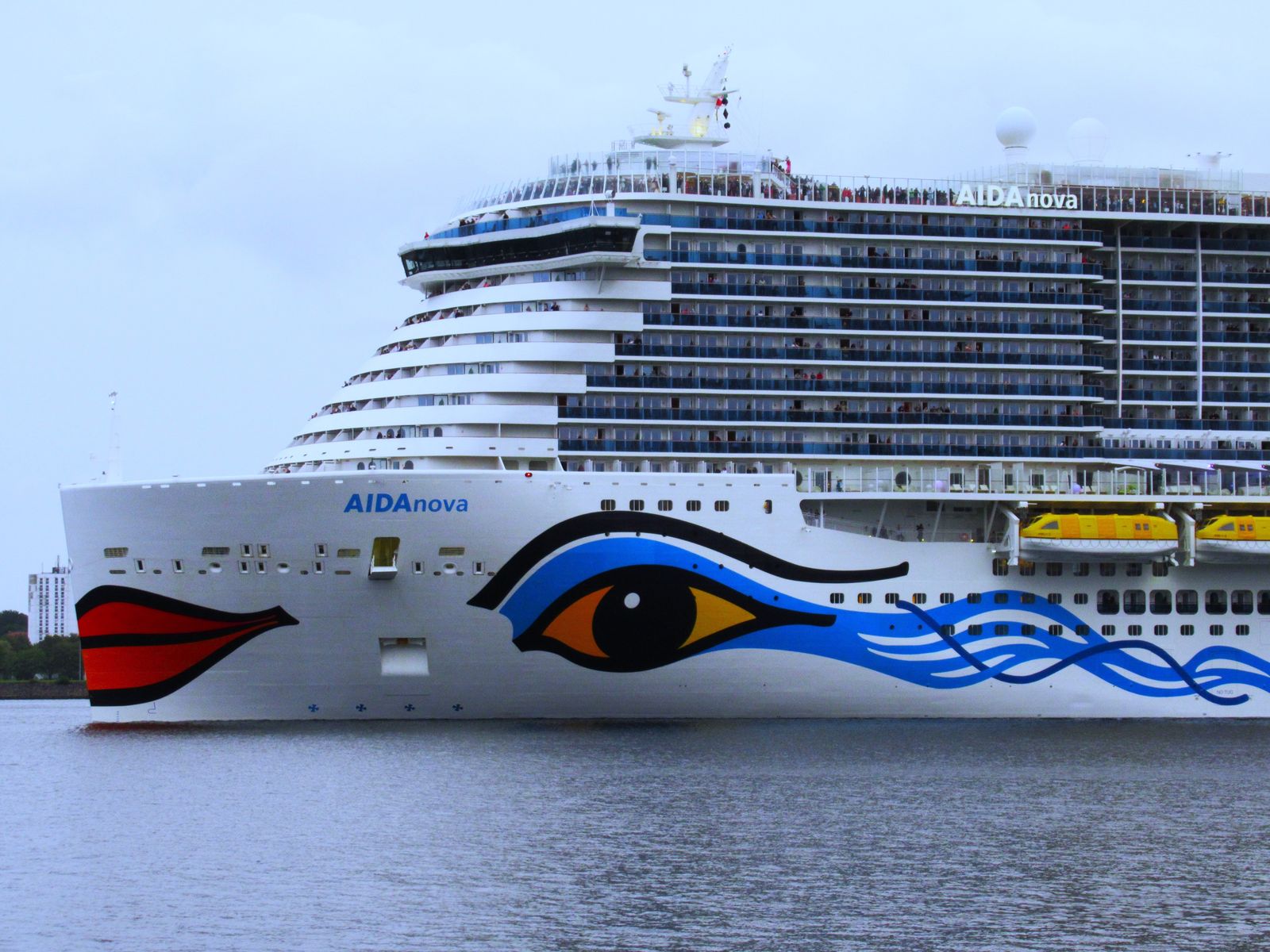 An Oberdeck genießen zahlreiche Passagiere ihre "Revierfahrt" mit der AIDAnova auf der "Kieler Förde"