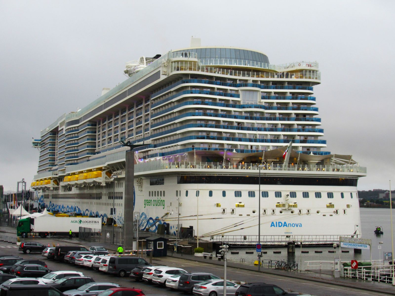 Die AIDAnova fährt um 18:34h ihr Auslaufmanöver auf der "Kieler Förde"