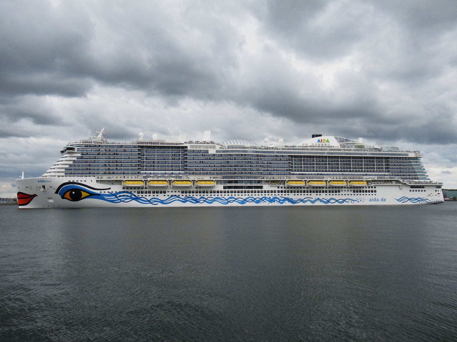 Die AIDAnova fährt unter einem grandiosen Wolkenpanorama ihre Revierfahrt auf der Kieler Förde