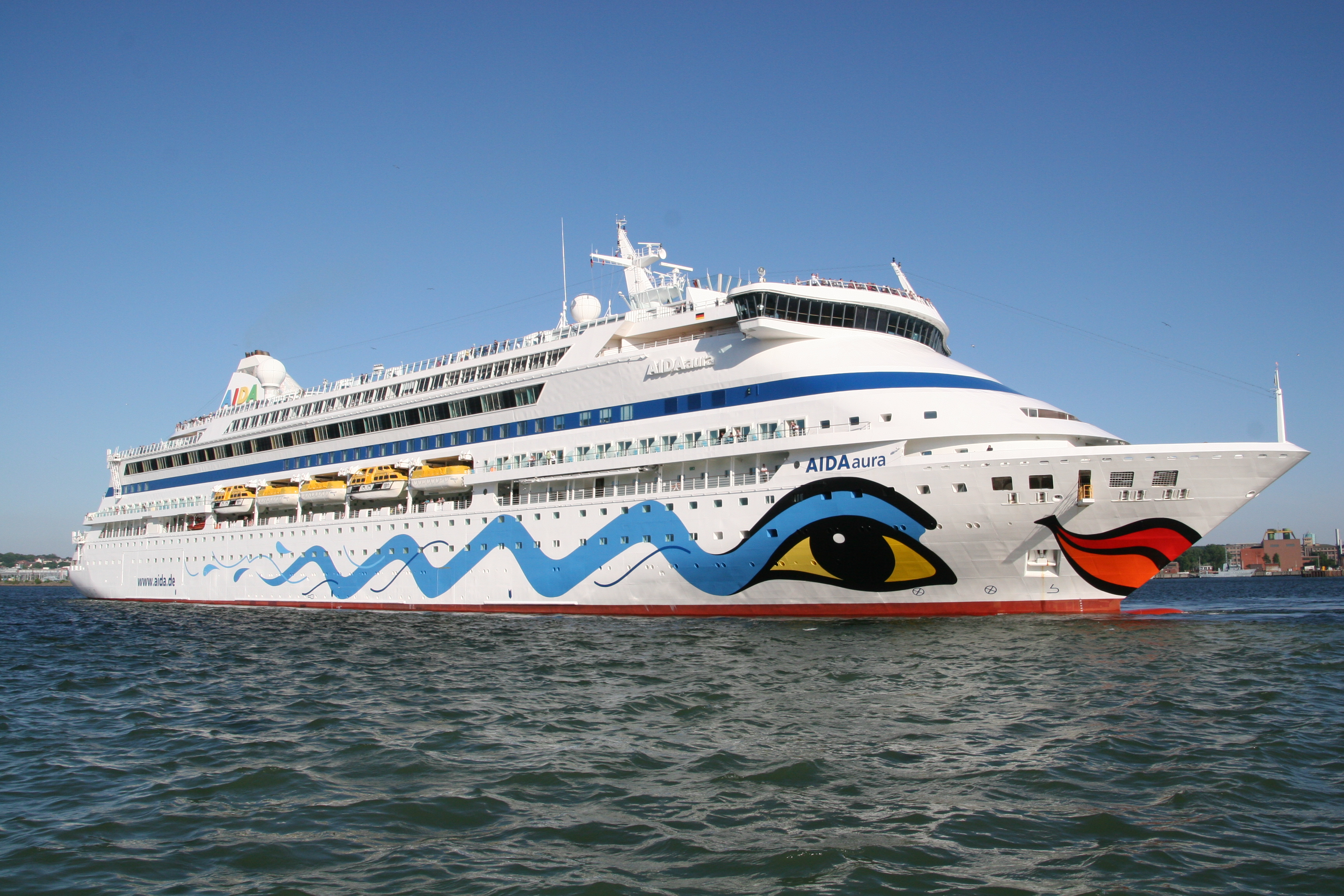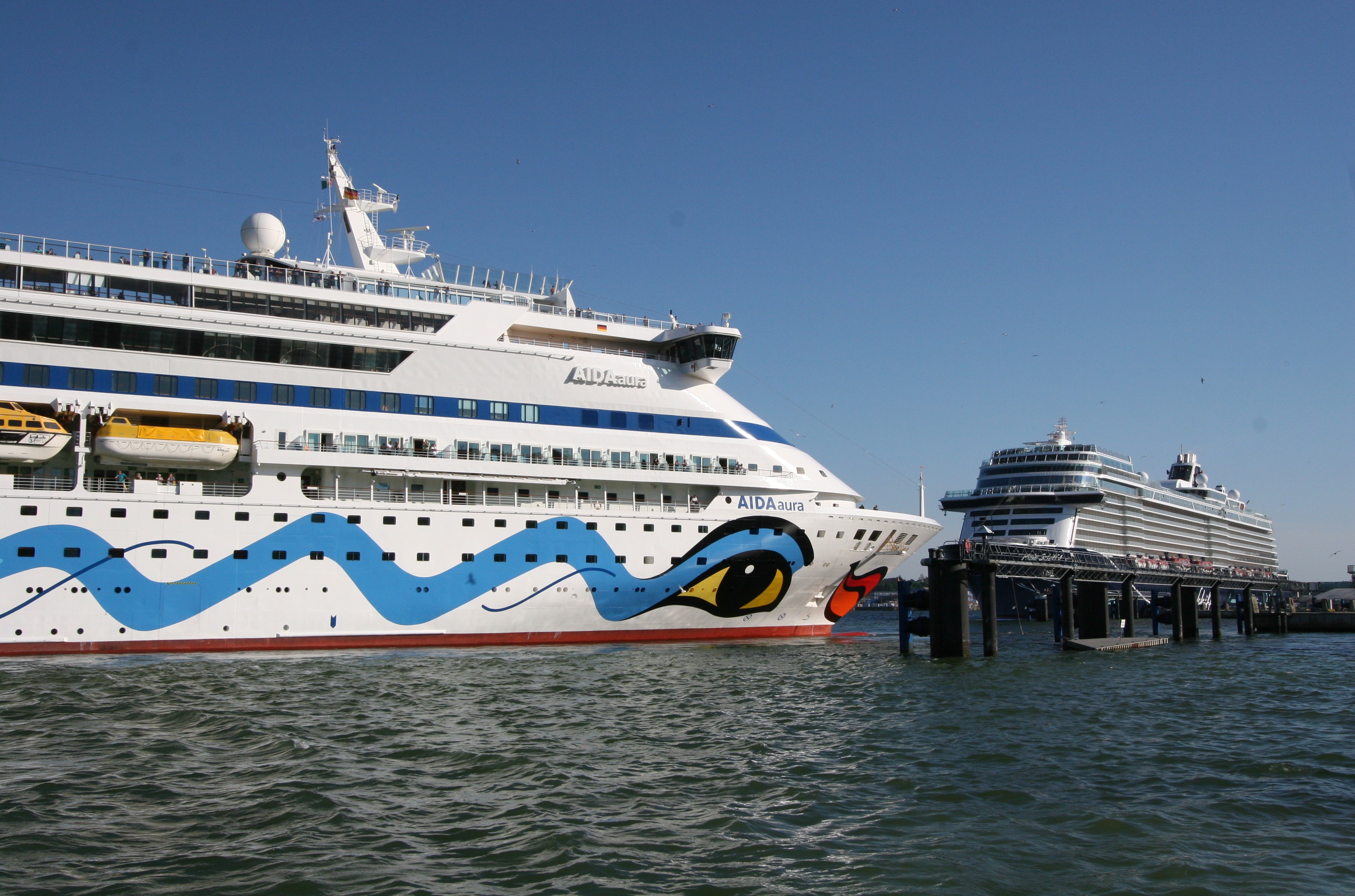 Nach der AIDAcara und der AIDAluna und der AIDAbella ist die AIDAaura auch in Kiel angekommen