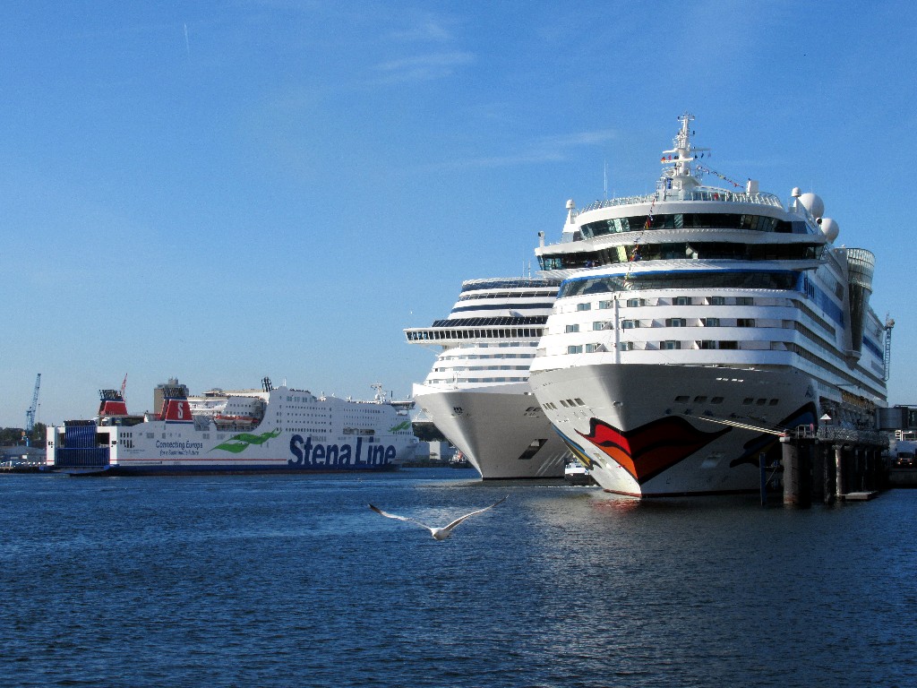 Die Stena Germanica fährt unter einem azurblauen Himmel in Höhe der MSC Preziosa und der AIDAluna ihr Einlaufmanöver zum Schwedenkai