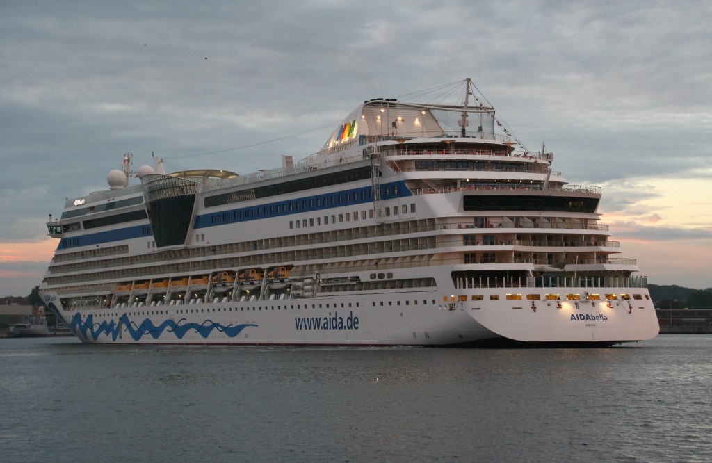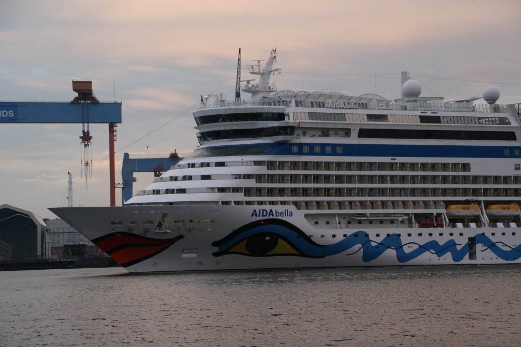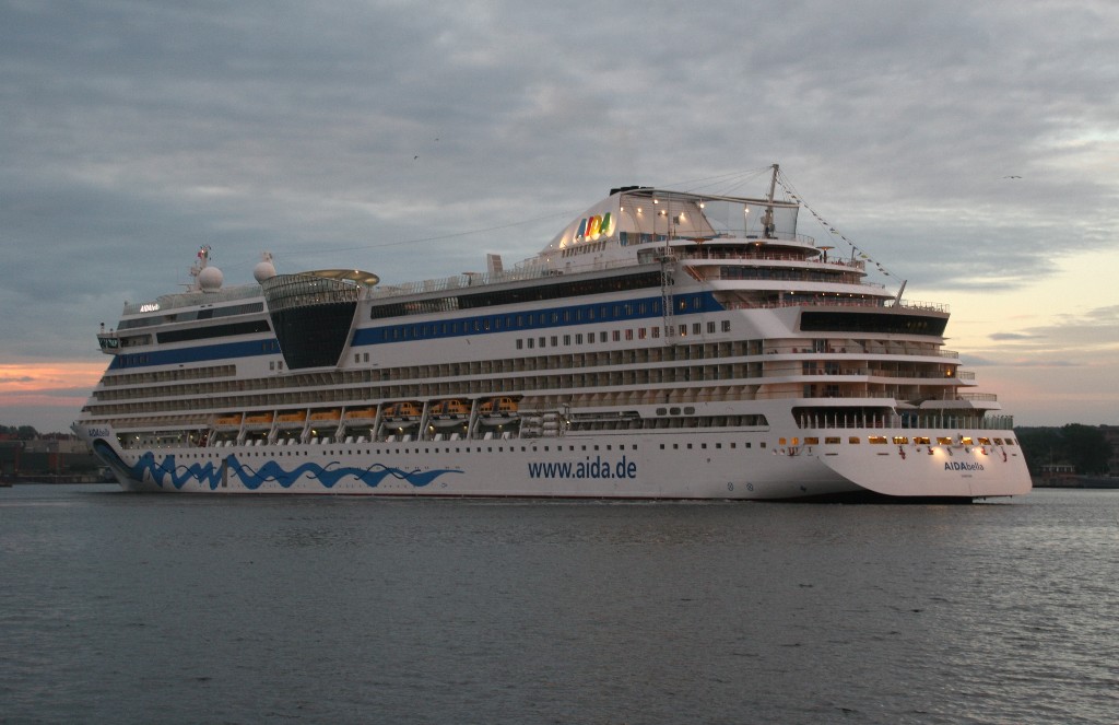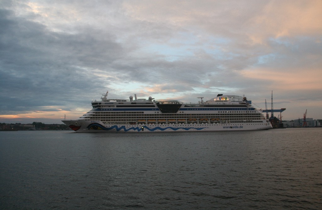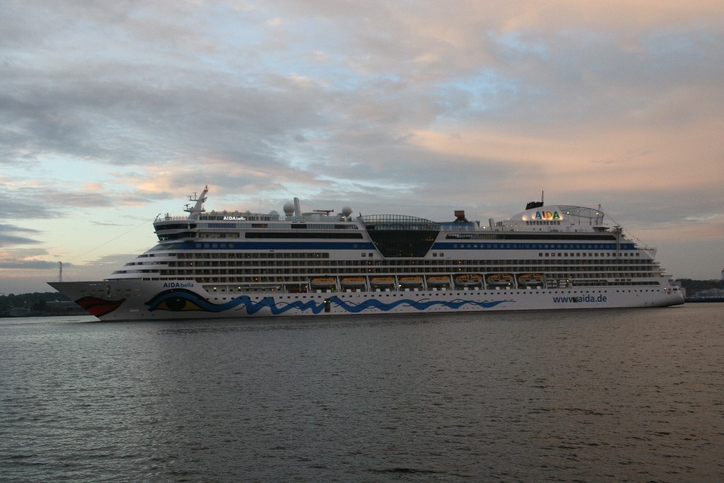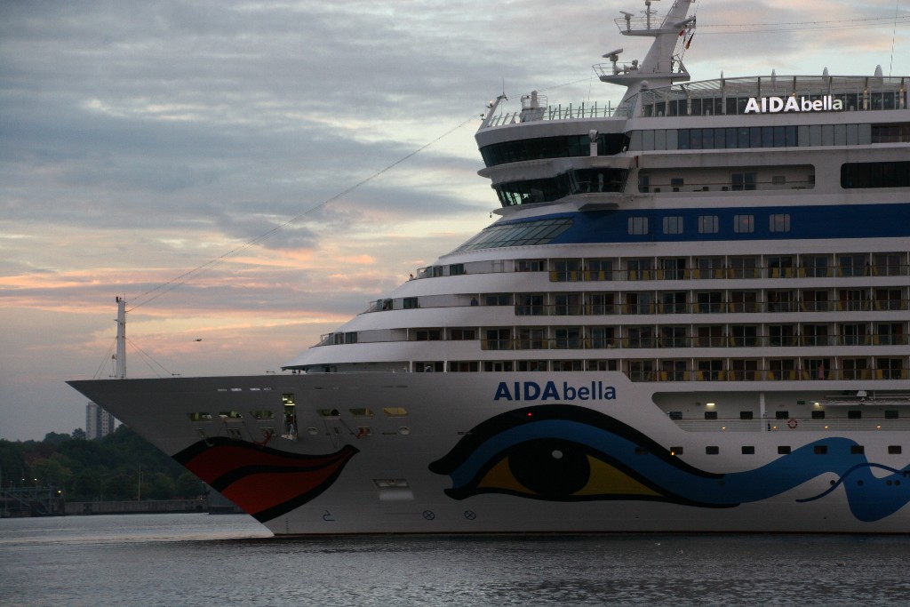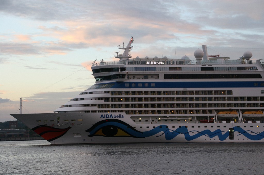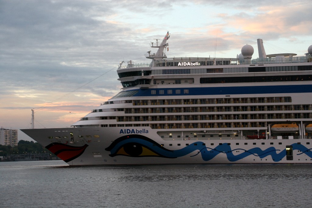 Die AIDAbella fährt in einer stimmungsvollen Atmosphäre rückwärts zum Liegeplatz 27 am Ostseekai