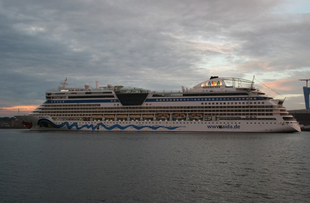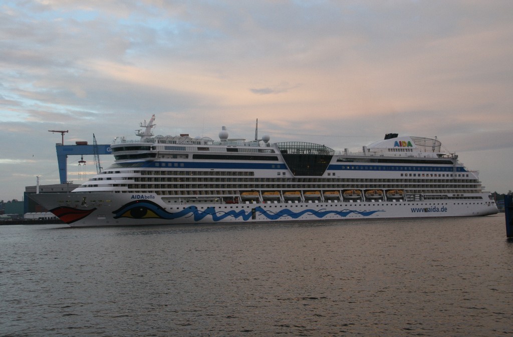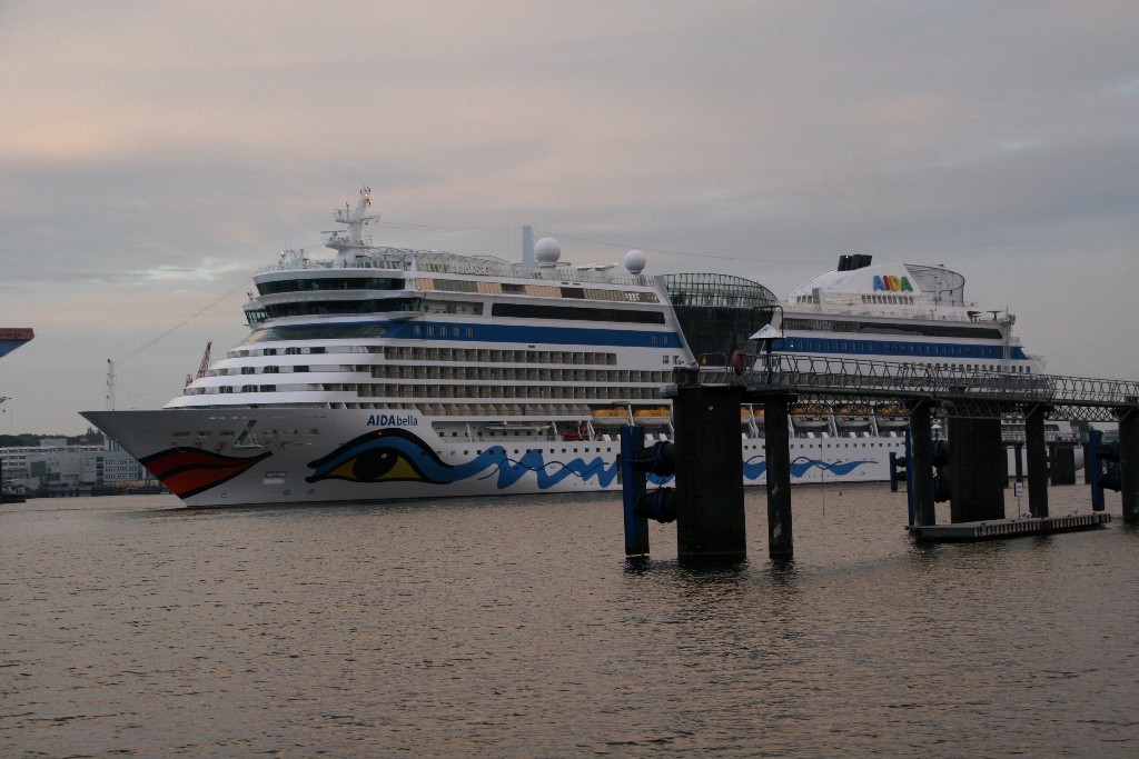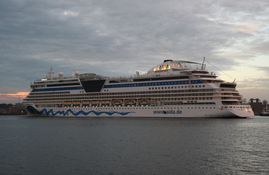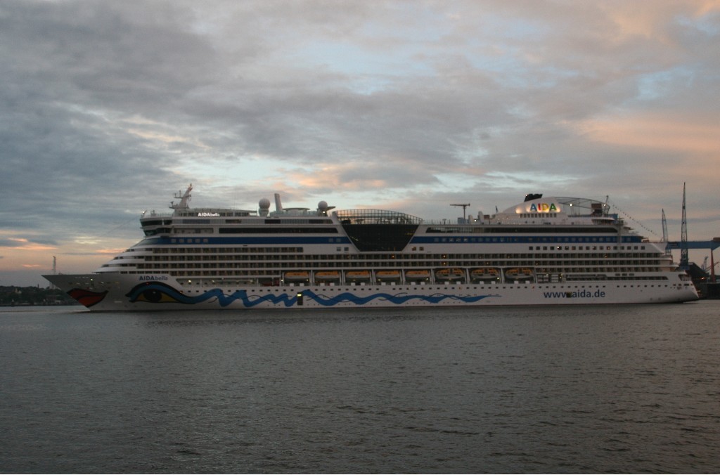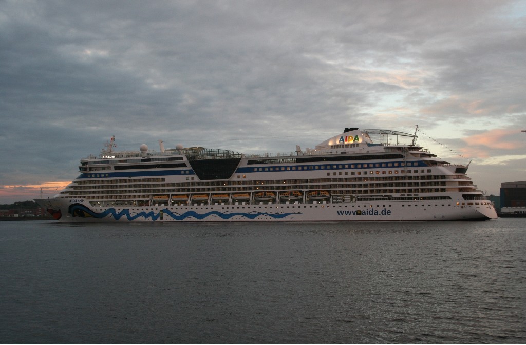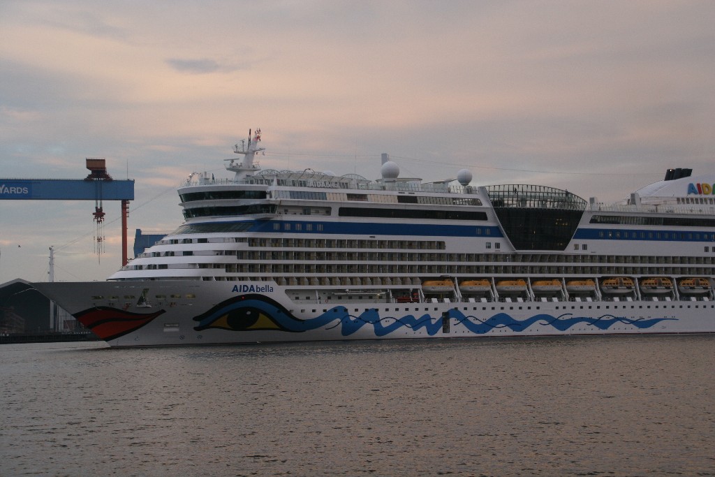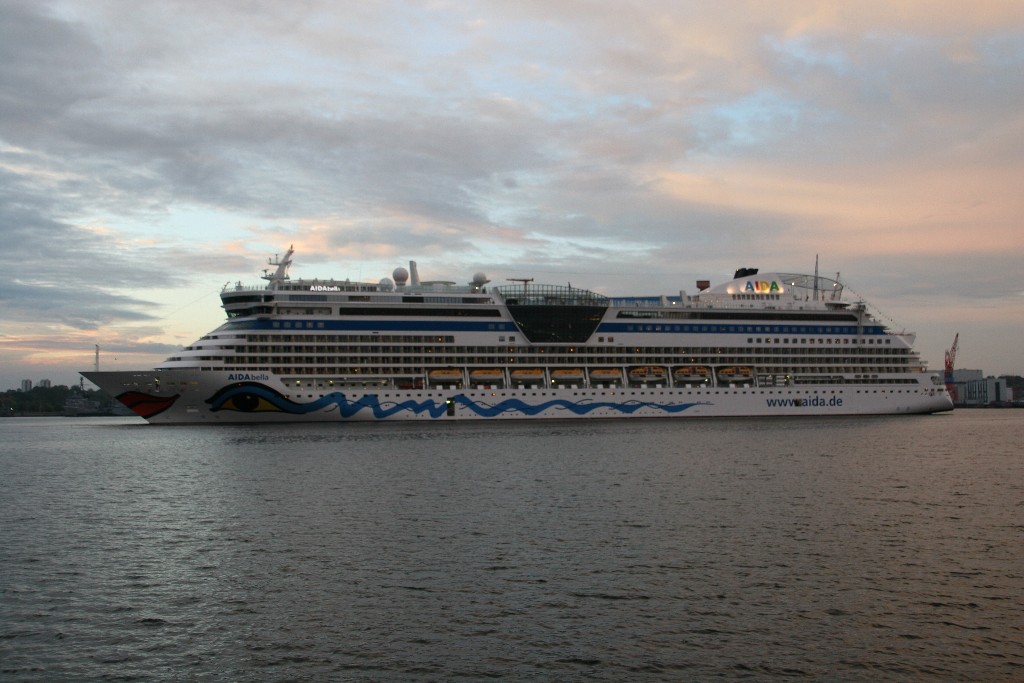 Die AIDAbella fährt in einer stimmungsvollen Atmosphäre rückwärts zum Liegeplatz 27 am Ostseekai