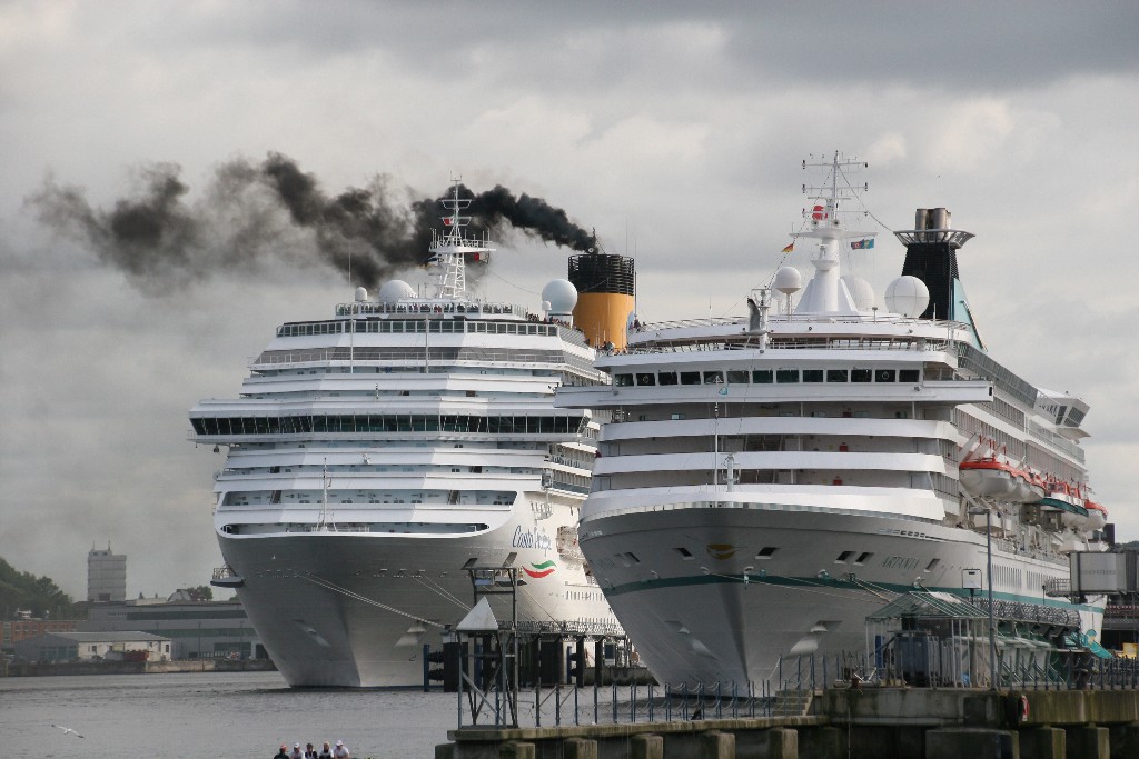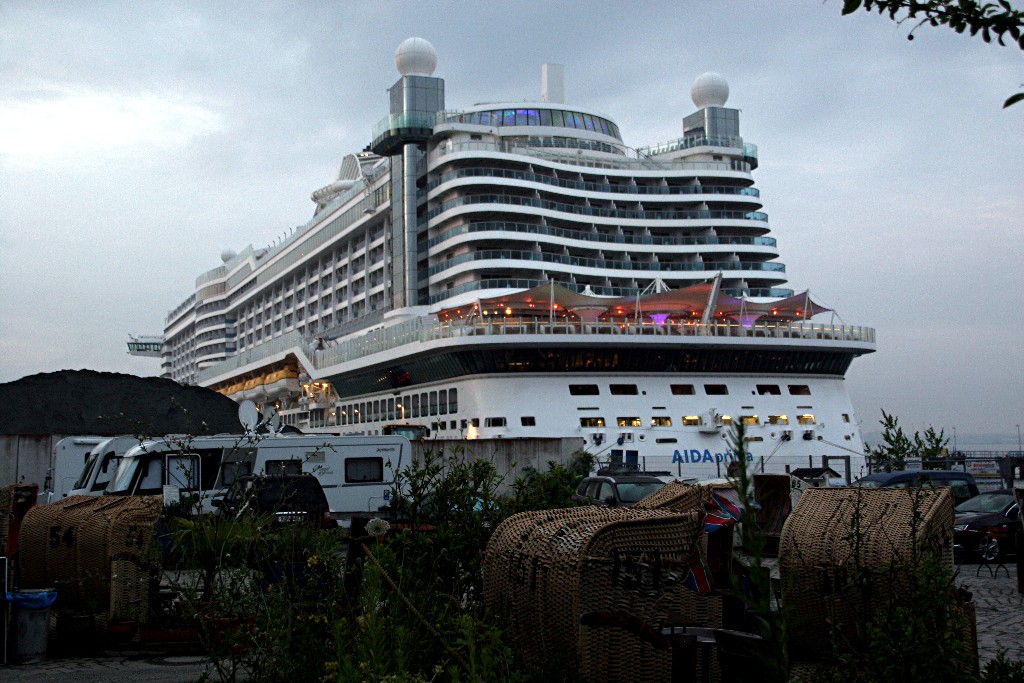 Die AIDAprima an ihrem Liegeplatz im "Scheerhafen" neben einer "Kieshalde"