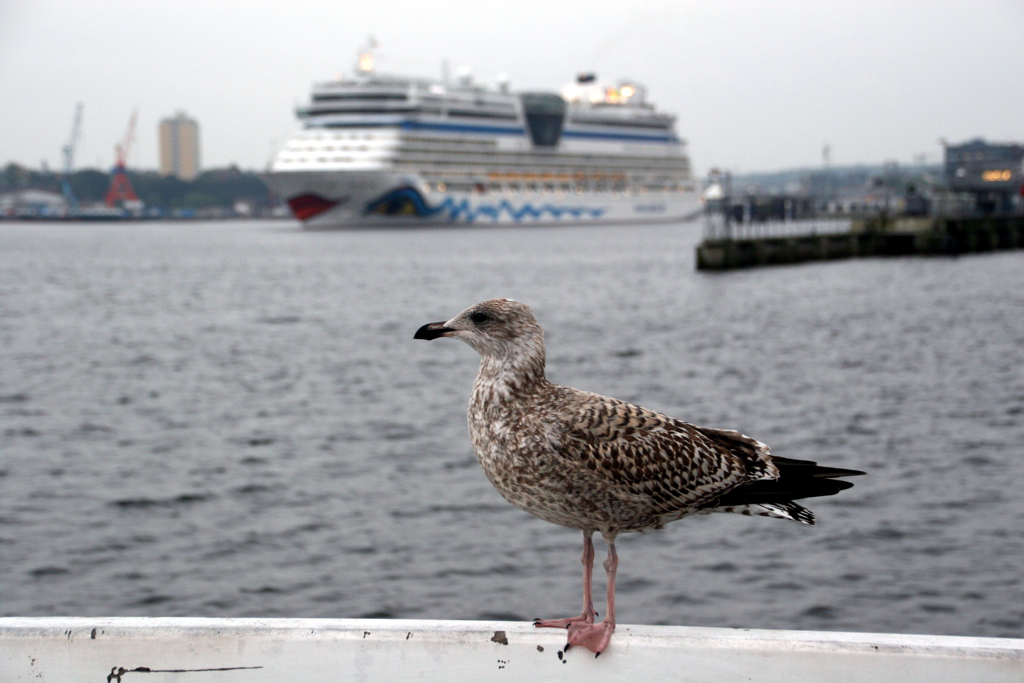 Vor dem Auslaufmanöver der AIDAprima hat sich diese Möwe auf dem Bootssteg mit mir ein kühles Bierchen geteilt