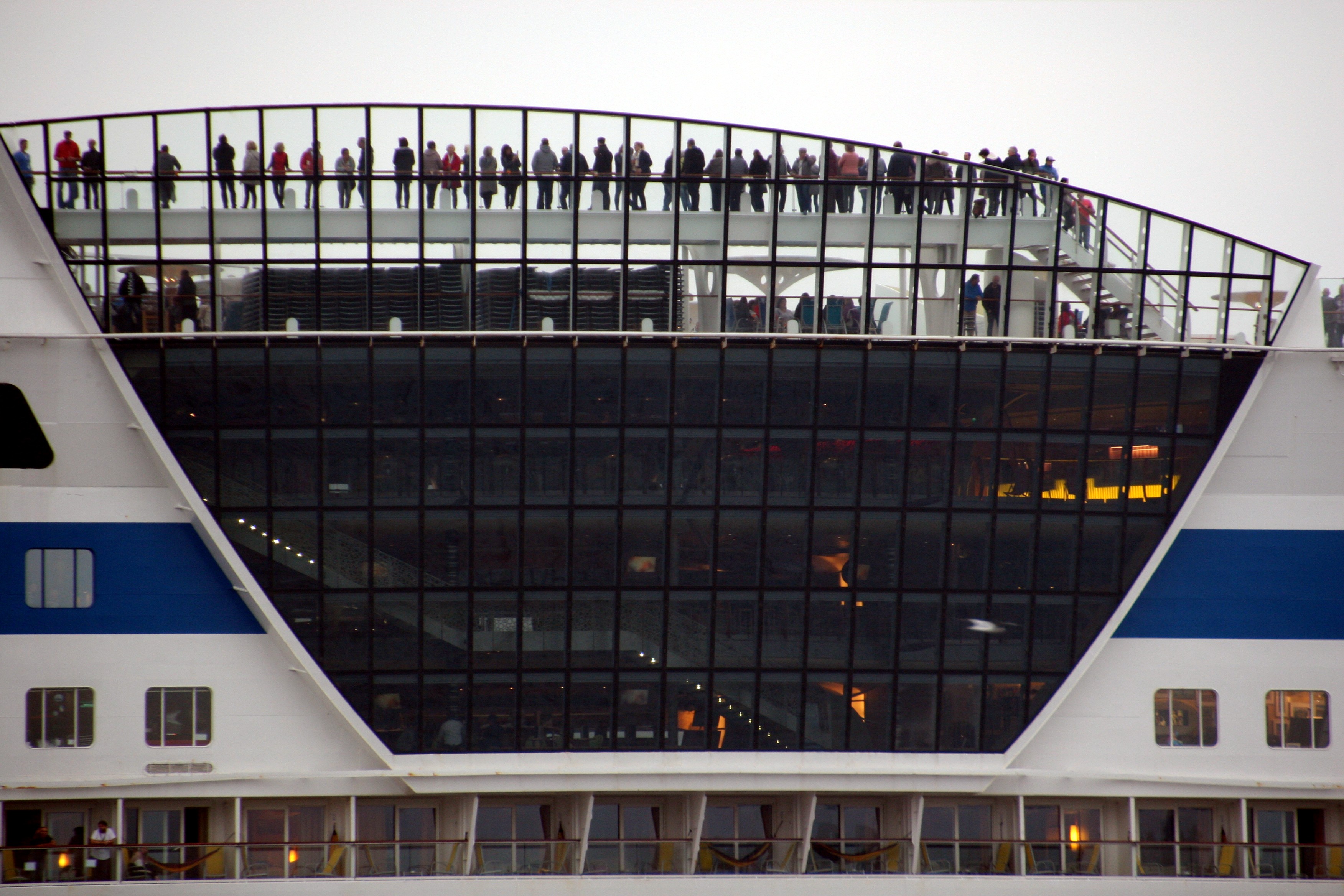 Zahlreiche "Sehleute" genießen an Oberdeck ihre Revierfahrt mit der AIDAbella auf der "Kieler Förde"