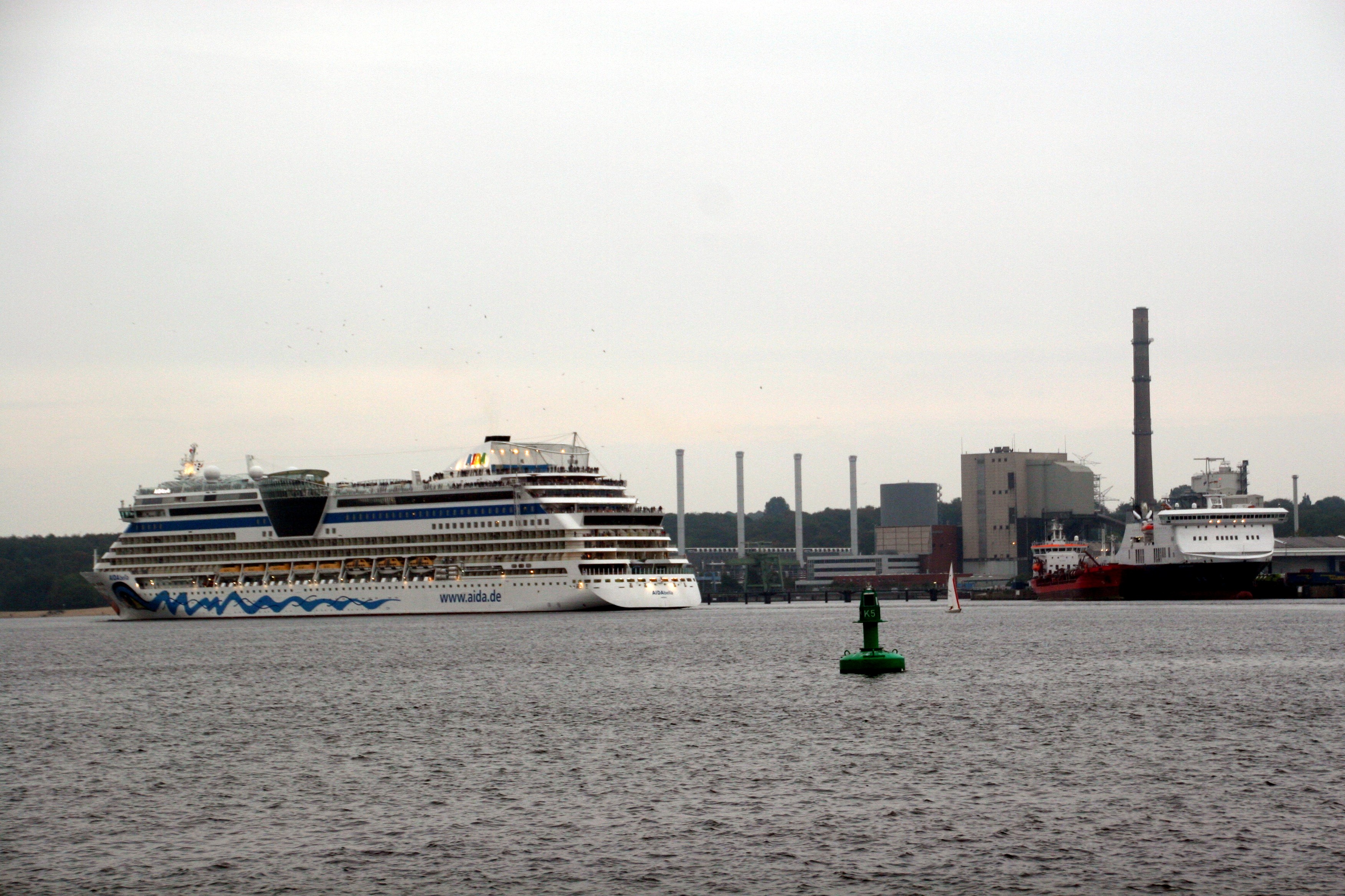 Die AIDAbella fährt ihre Revierfahrt auf der "Kieler Förde" in Höhe des noch schönstgelegenen aber stillgelegten Kraftwerks in Deutschland