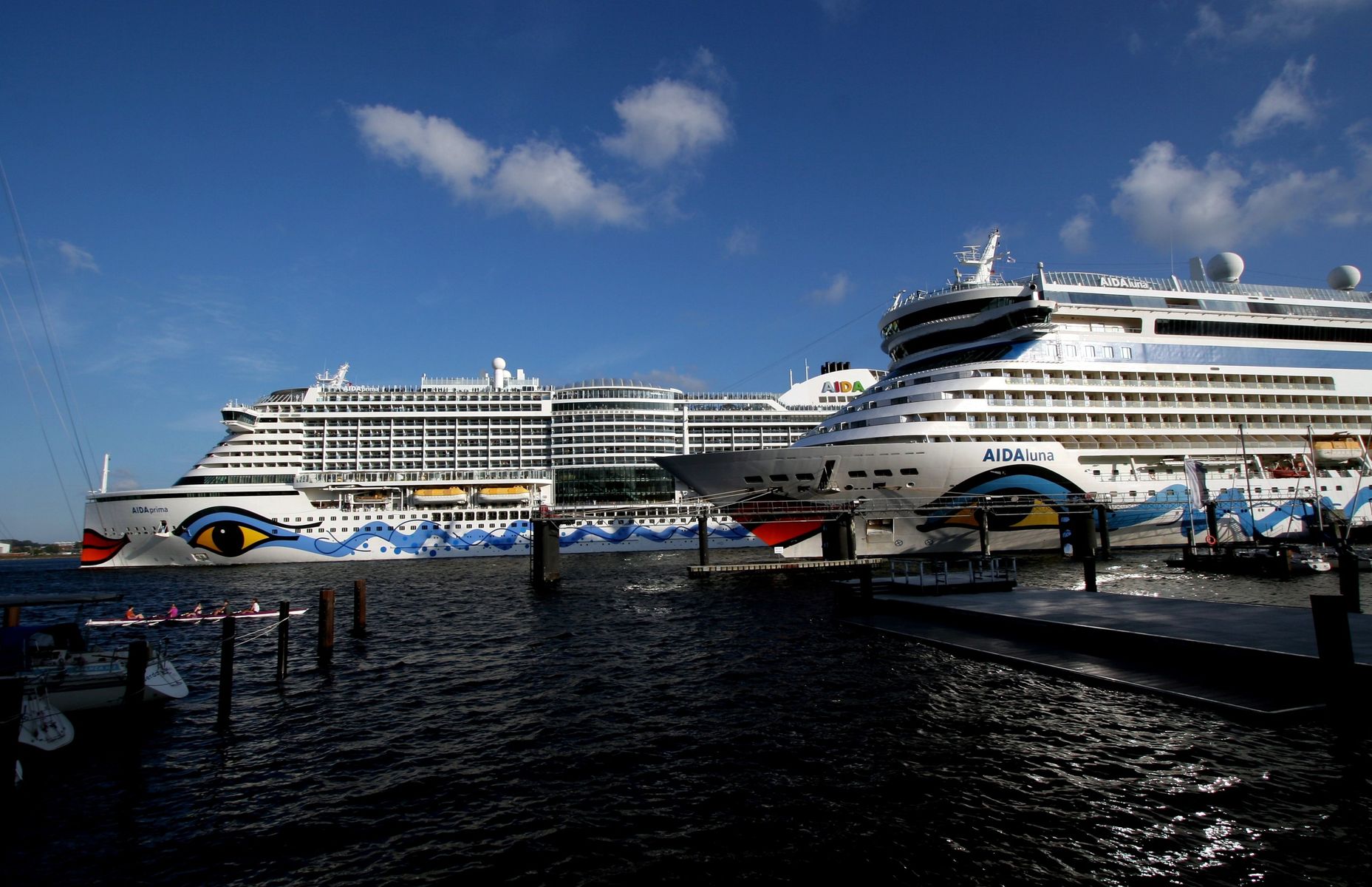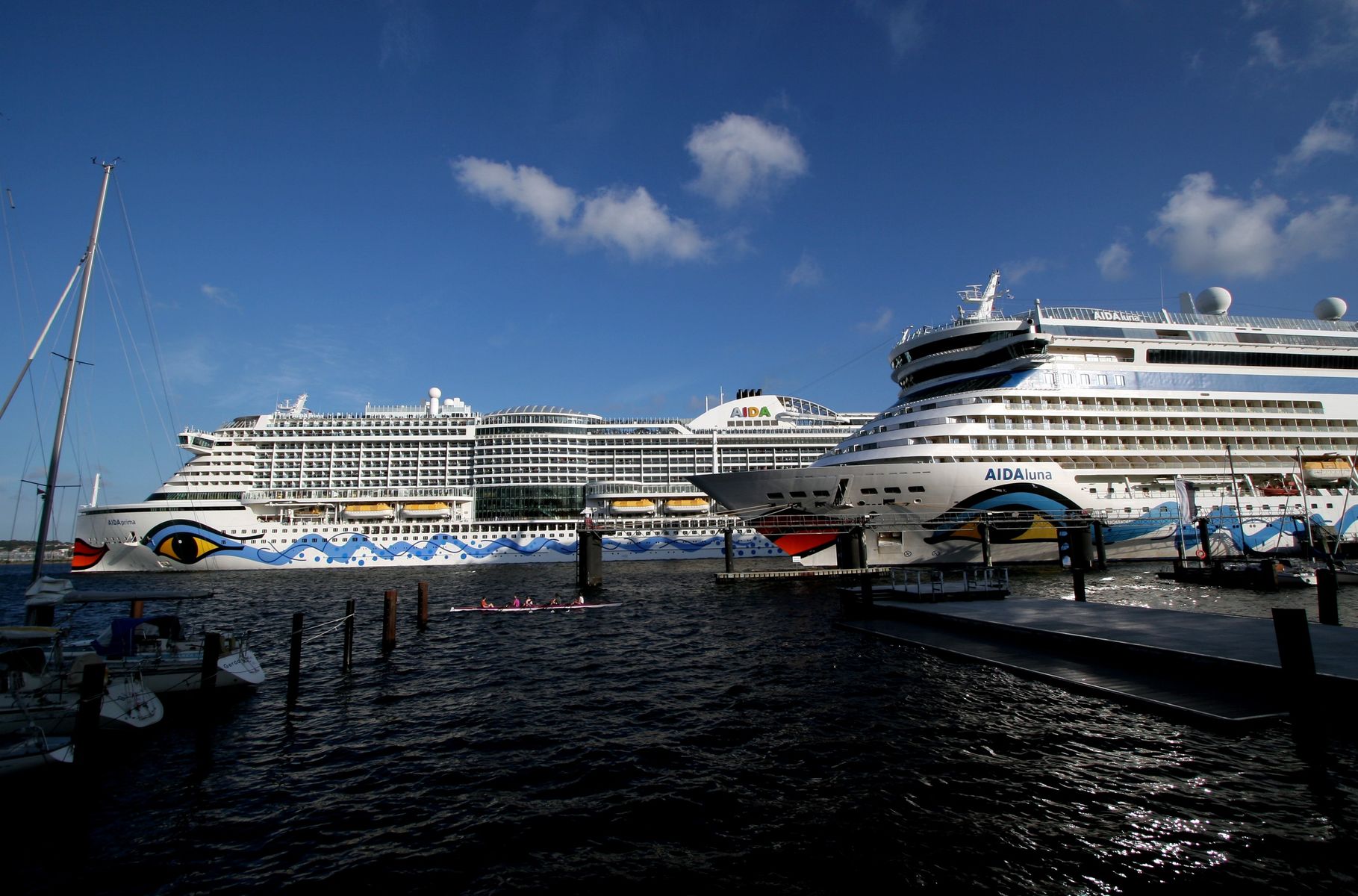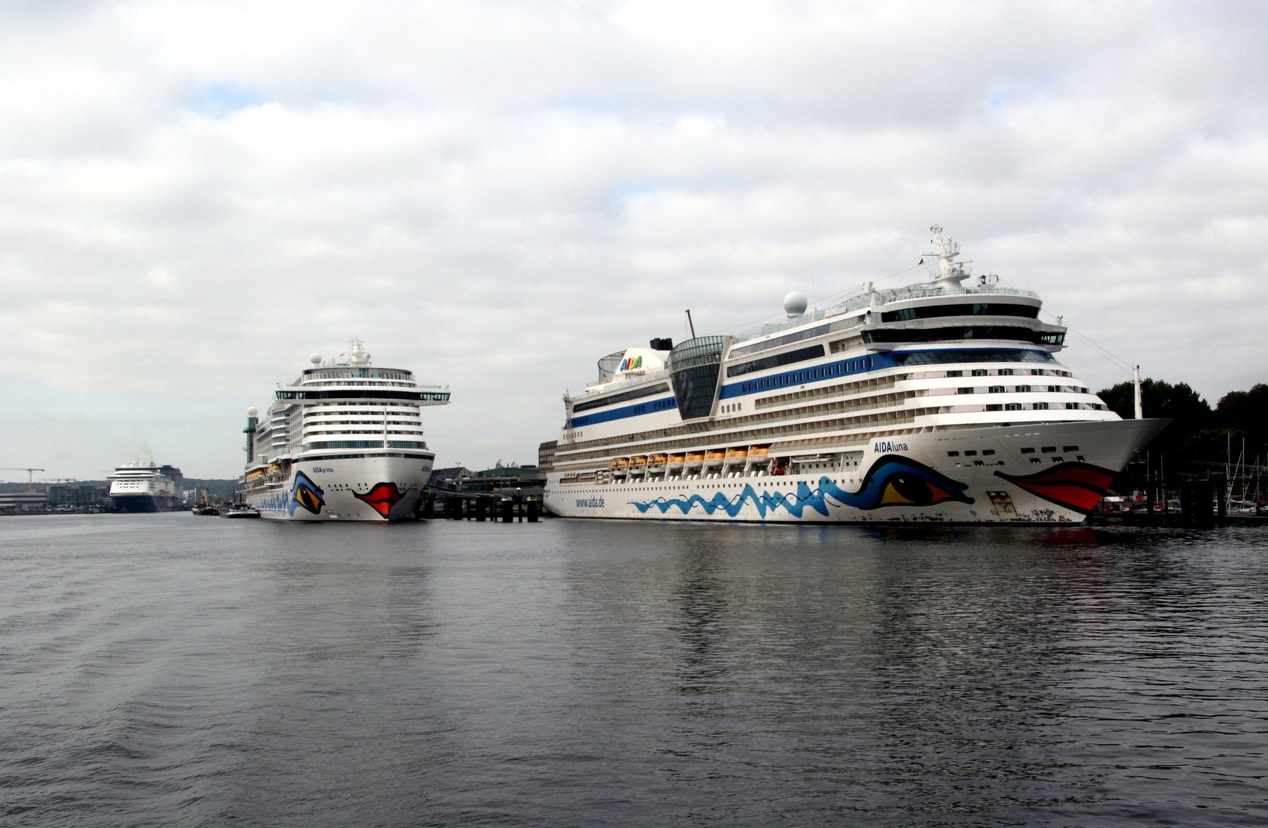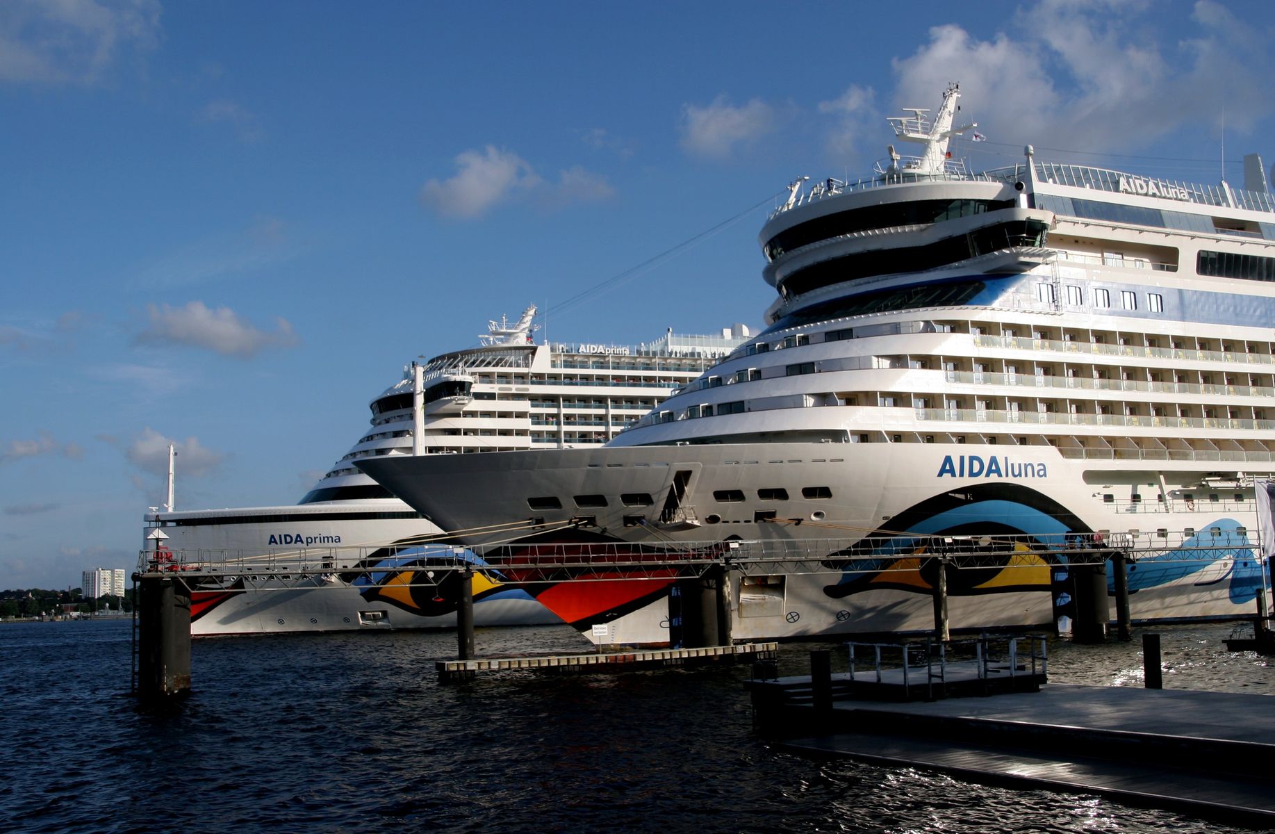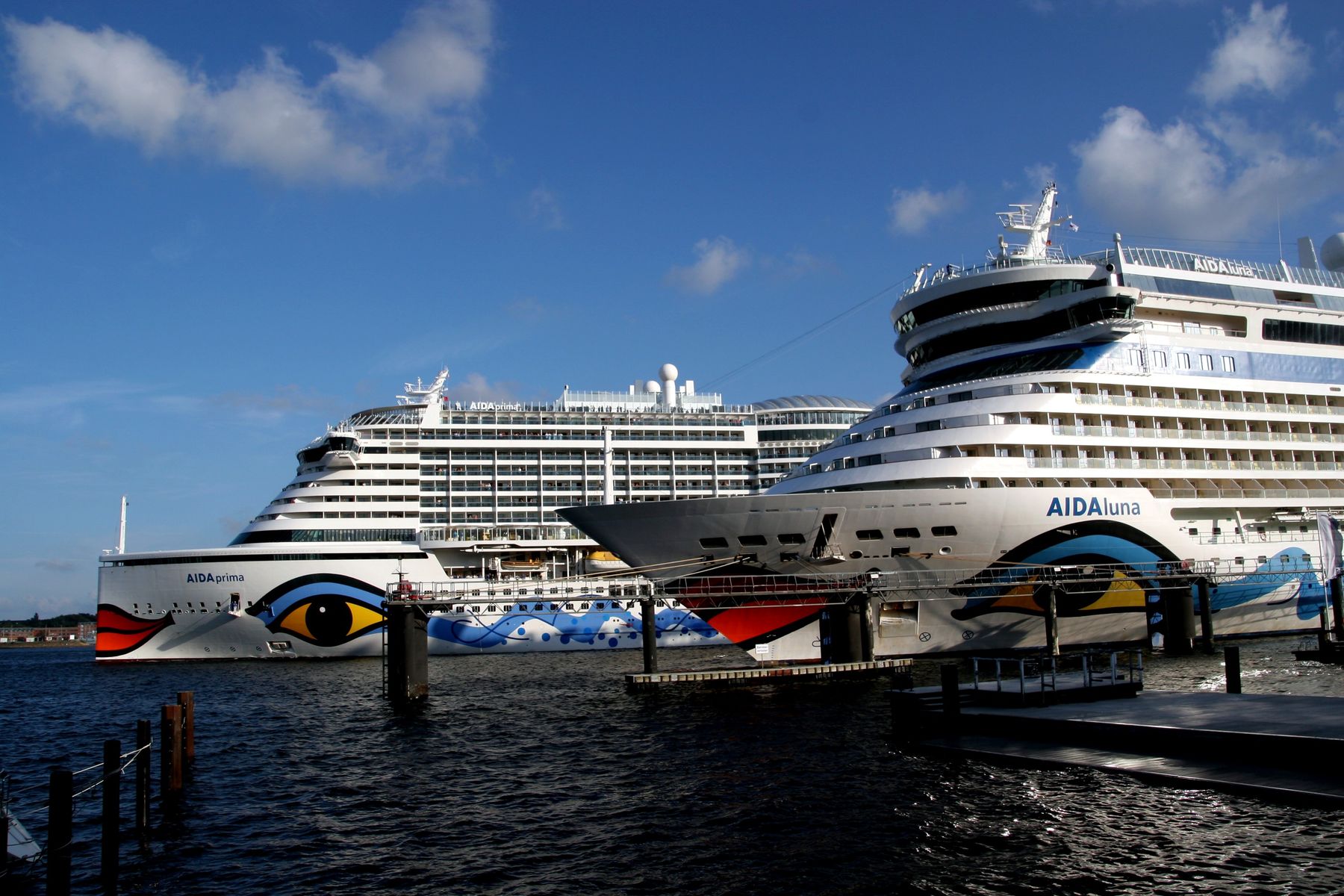Die AIDAluna (LP28) und AIDAprima (LP27) unter einem azurblauen Himmel mit faszinierenden Schönwetterwolken am Ostseekai