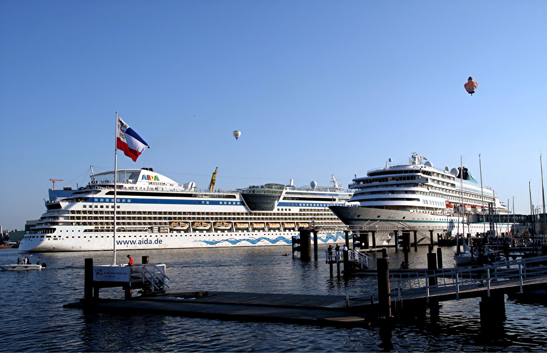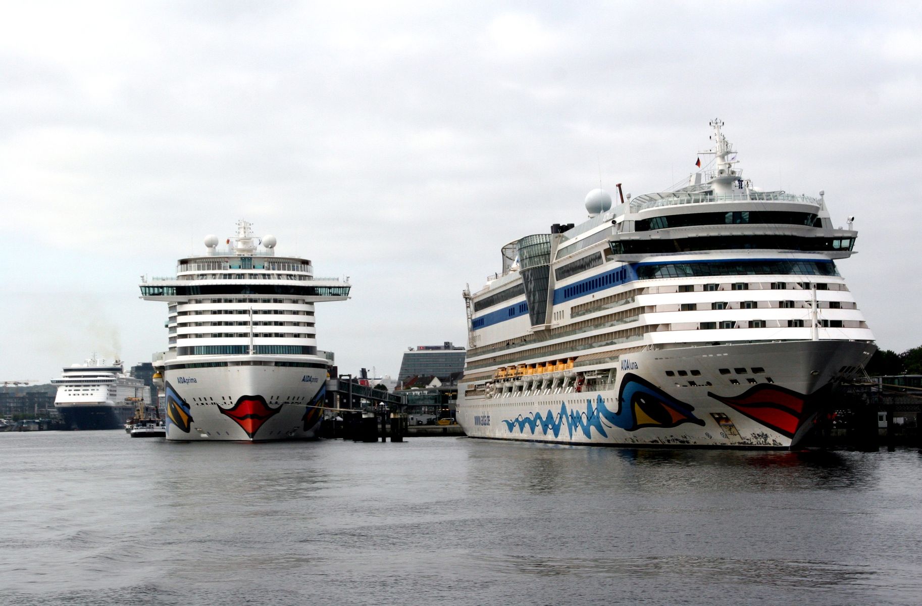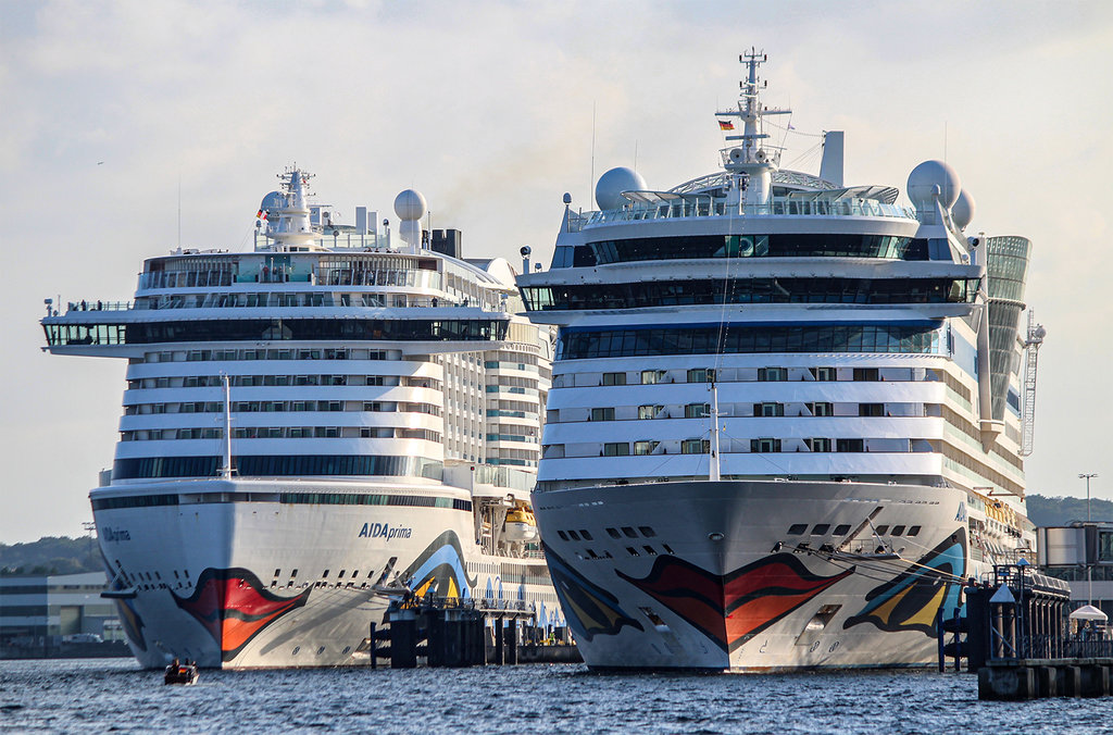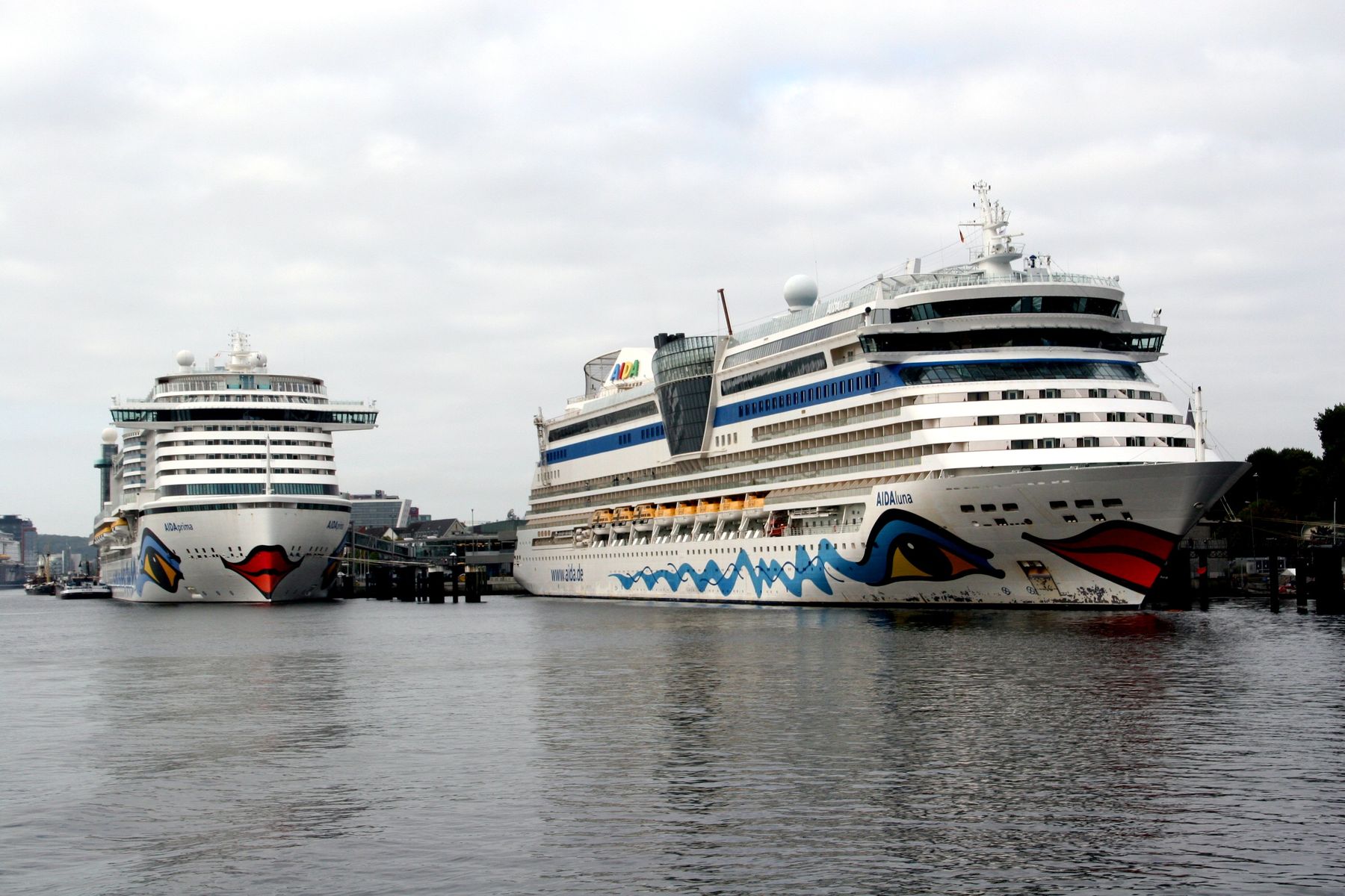 Die AIDAluna (LP28) und AIDAprima (LP27) unter einem azurblauen Himmel mit faszinierenden Schönwetterwolken am Ostseekai