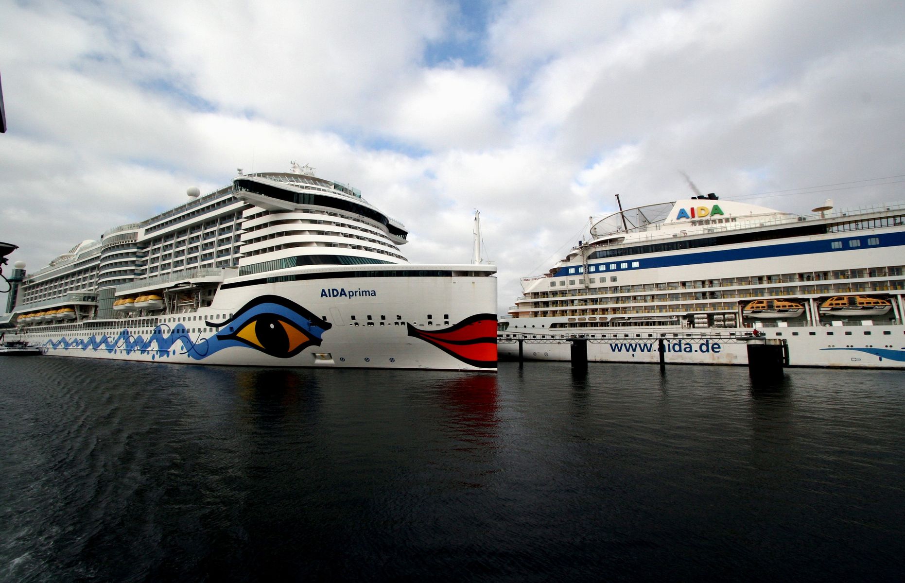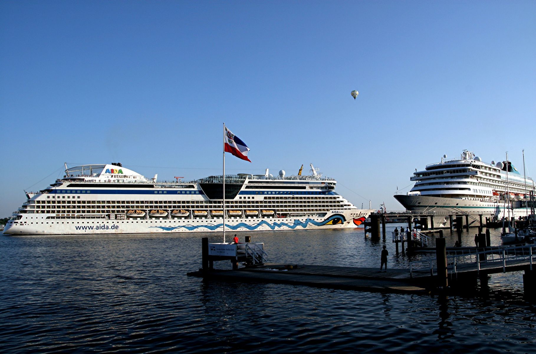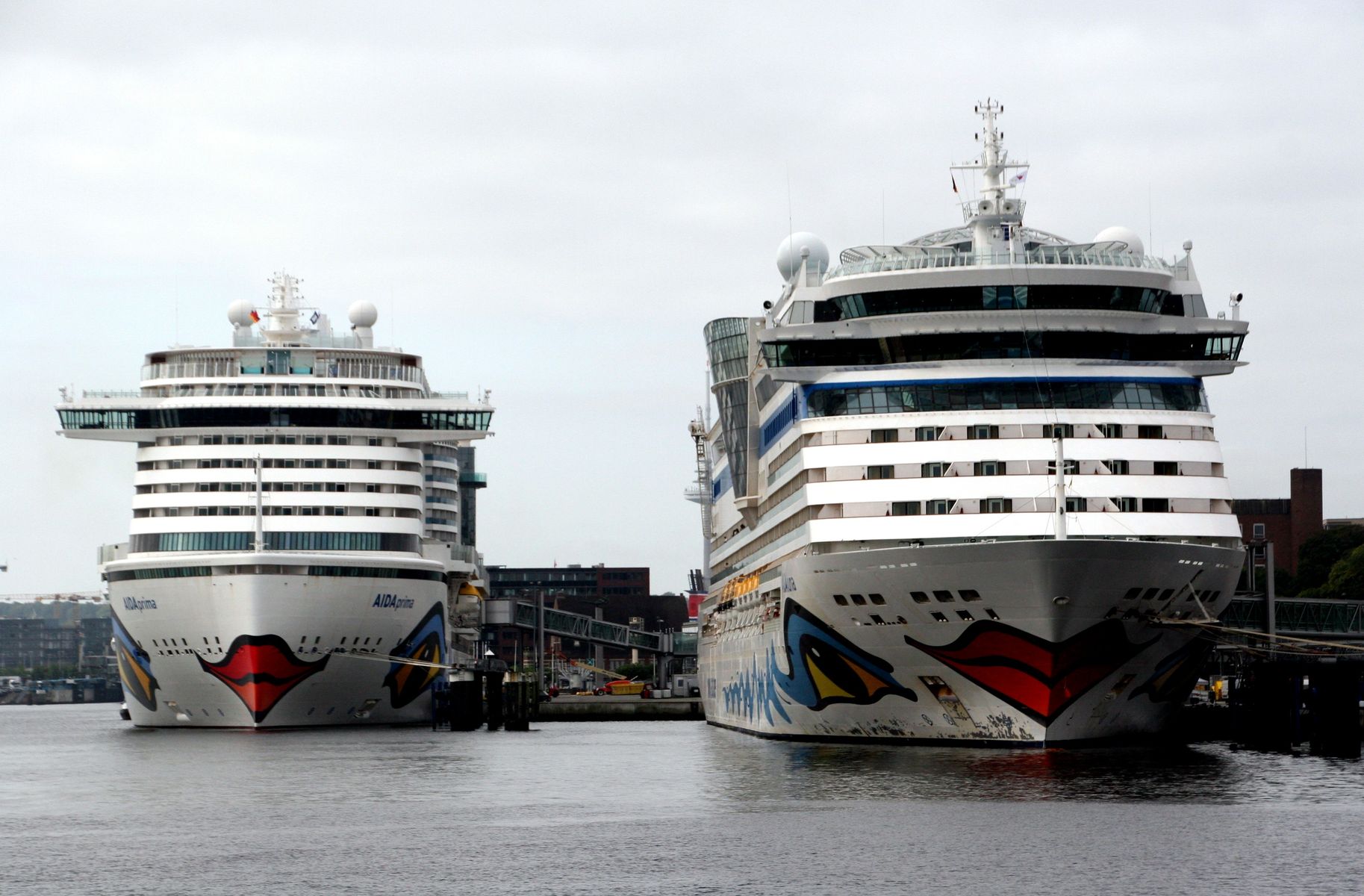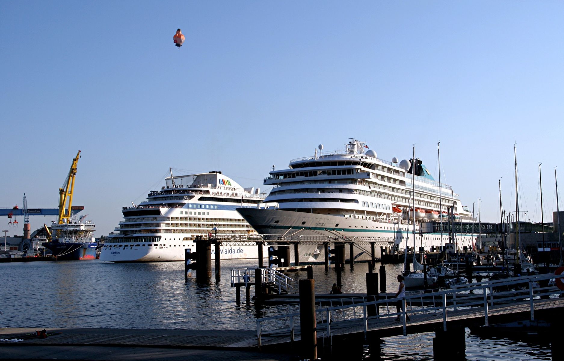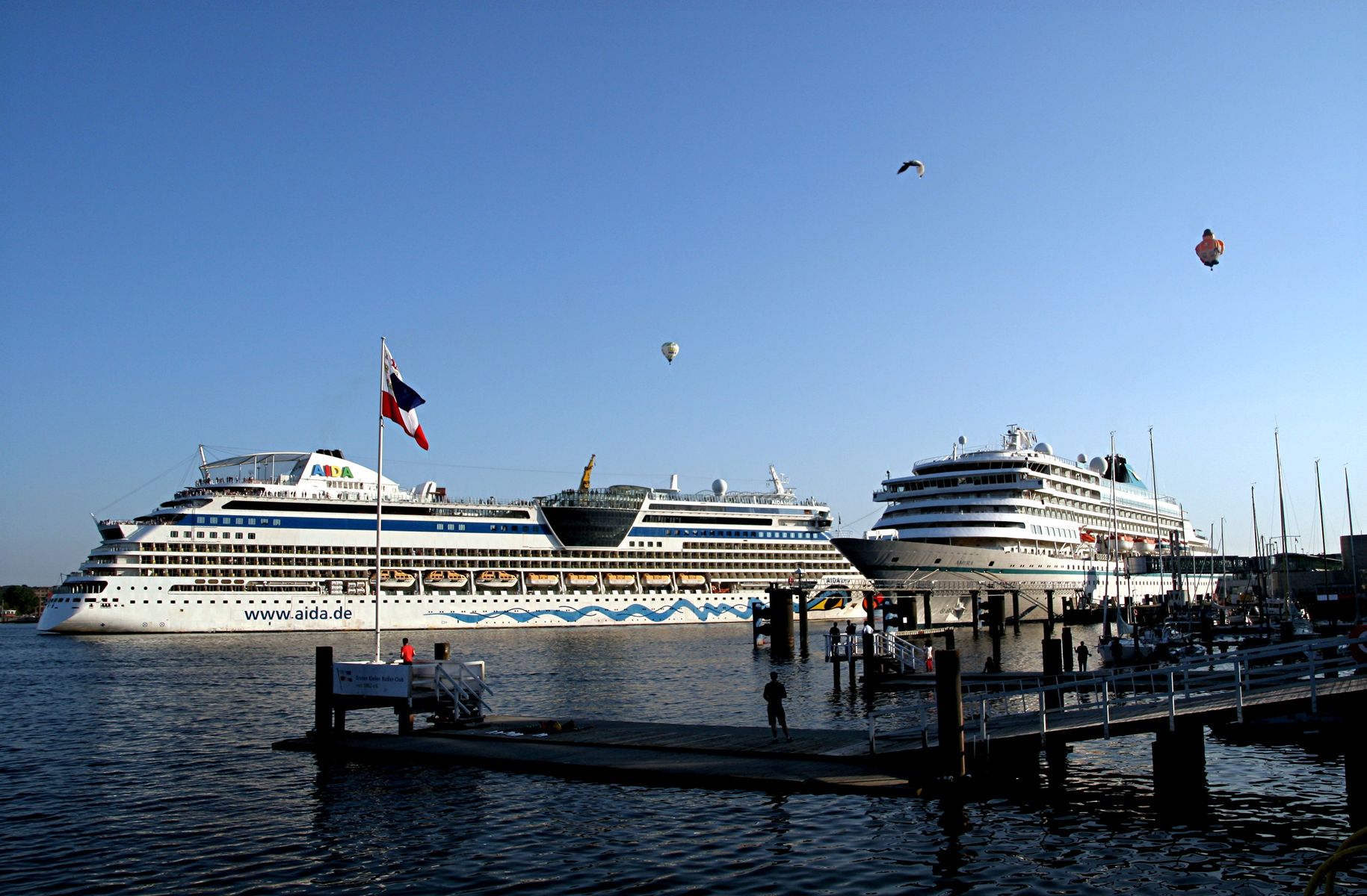 Die AIDAluna (LP28) und AIDAprima (LP27) unter einem azurblauen Himmel mit faszinierenden Schönwetterwolken am Ostseekai