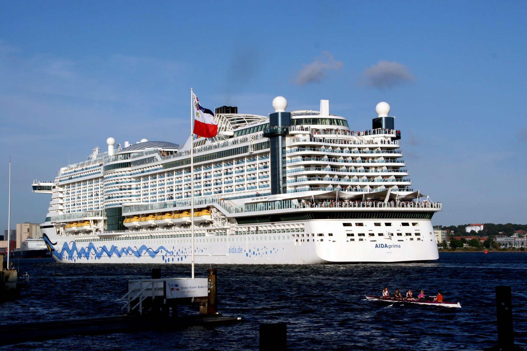 Das schnelle Ruderboot wird die AIDAprima während ihrem Auslaufmanöver sicherlich auch noch überholen
