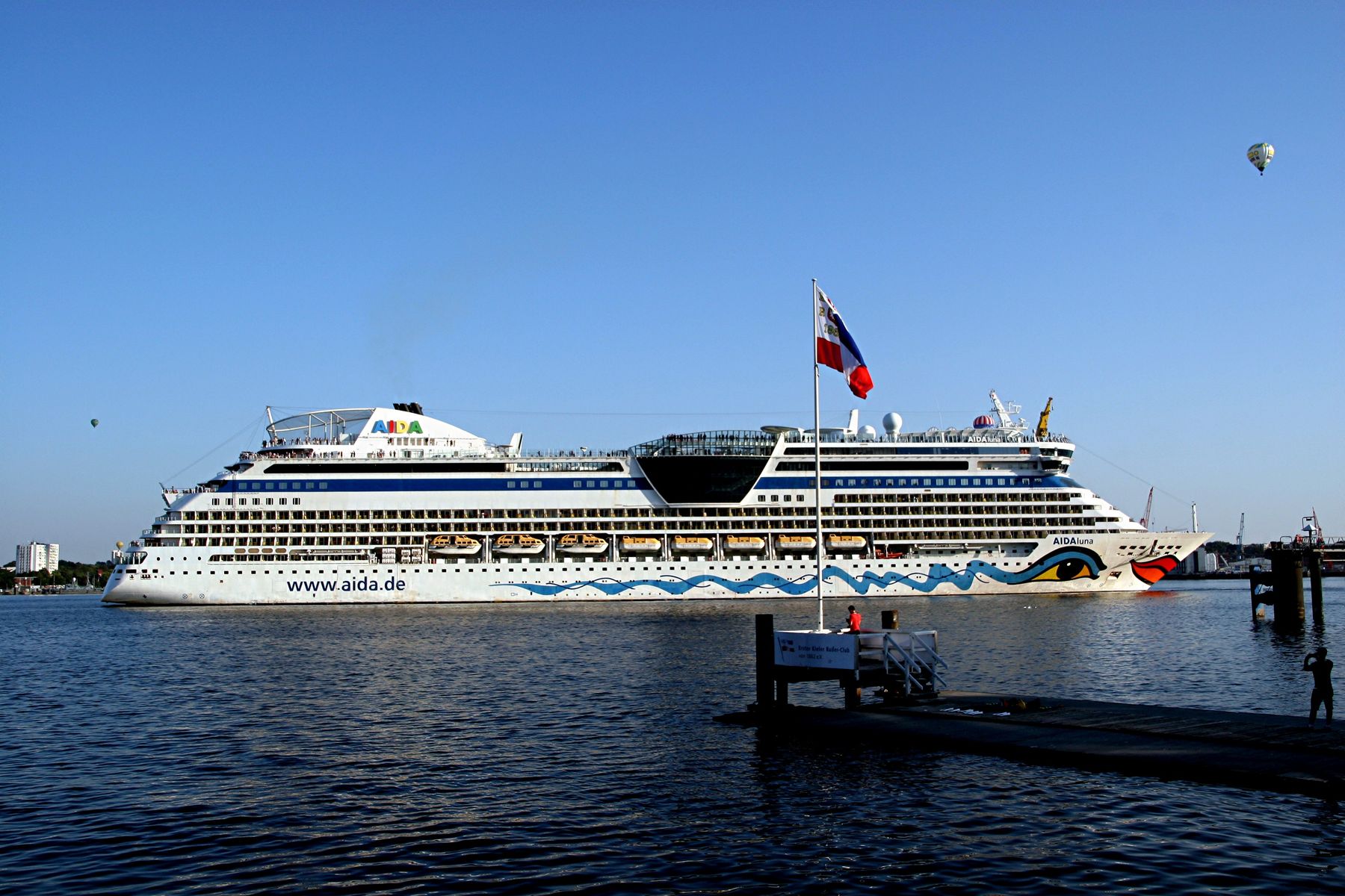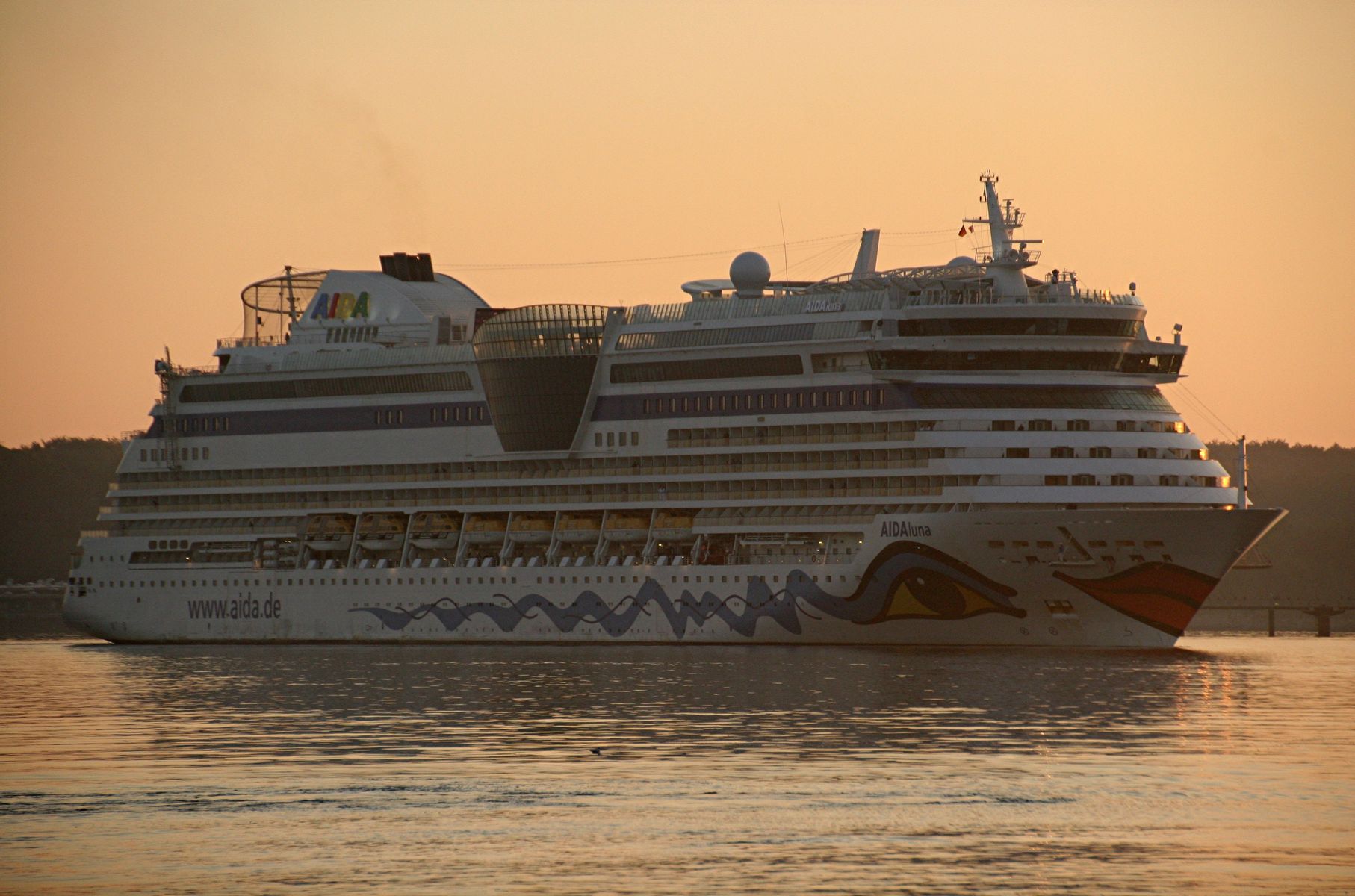 Die AIDAluna fährt um 18:09 h auf der "Kieler Förde" ihr Auslaufmanöver in Höhe der Amera an ihrem "Liegeplatz 28" am Ostseekai