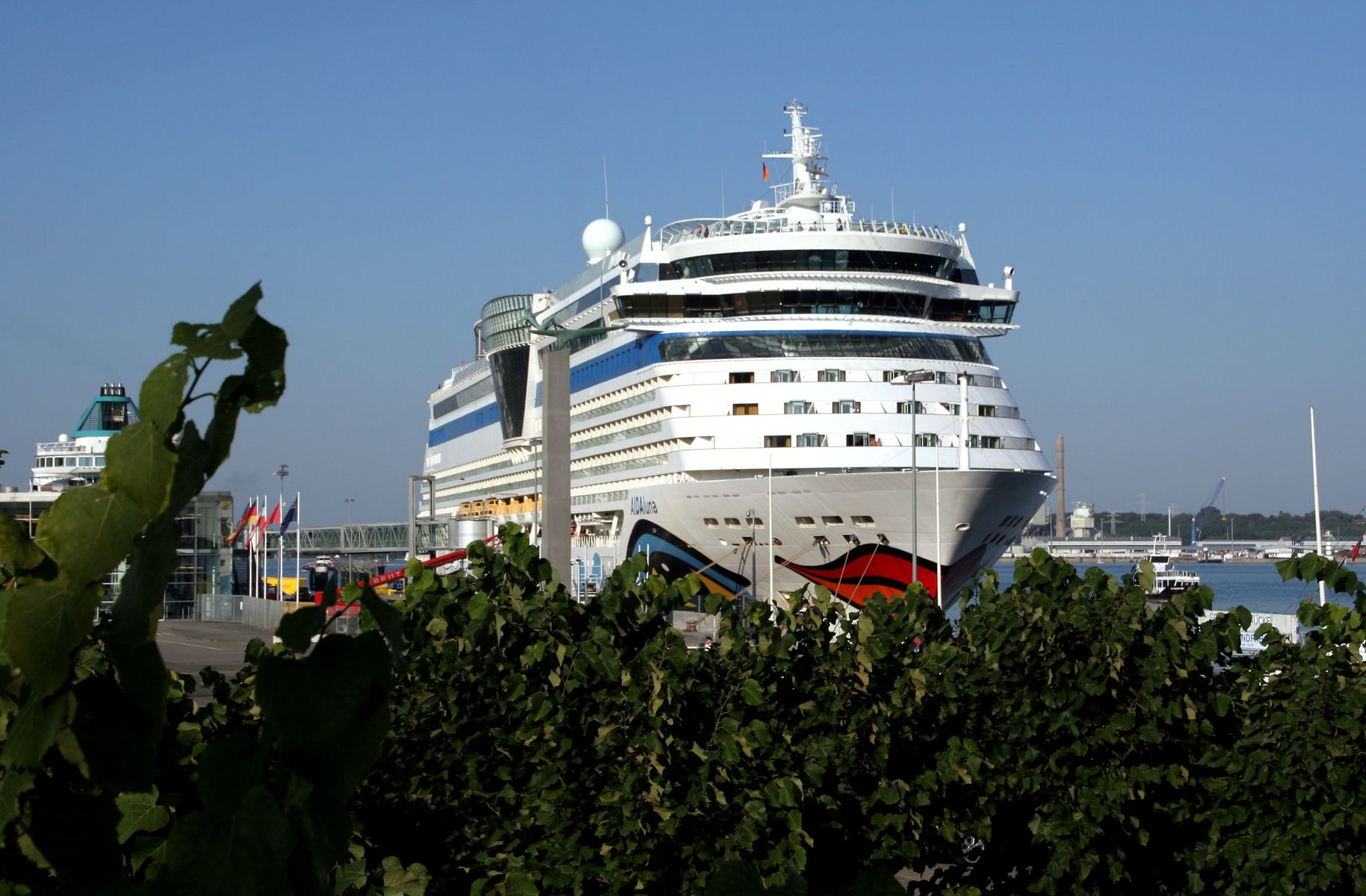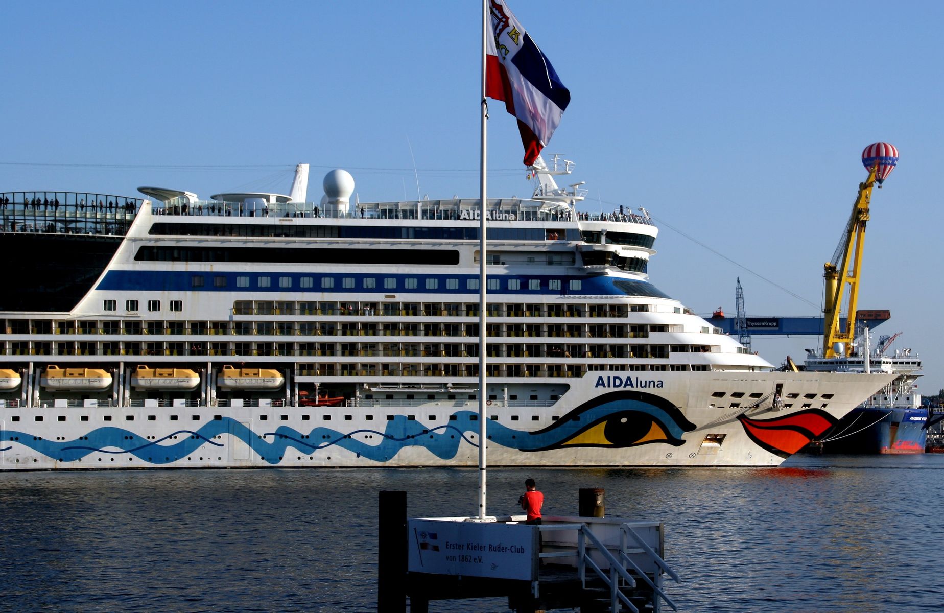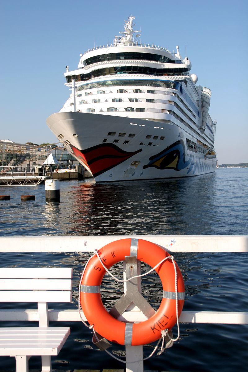 Die AIDAluna unter einem azurblauen Himmel an ihrem "Liegeplatz 27" am Ostseekai in Kiel