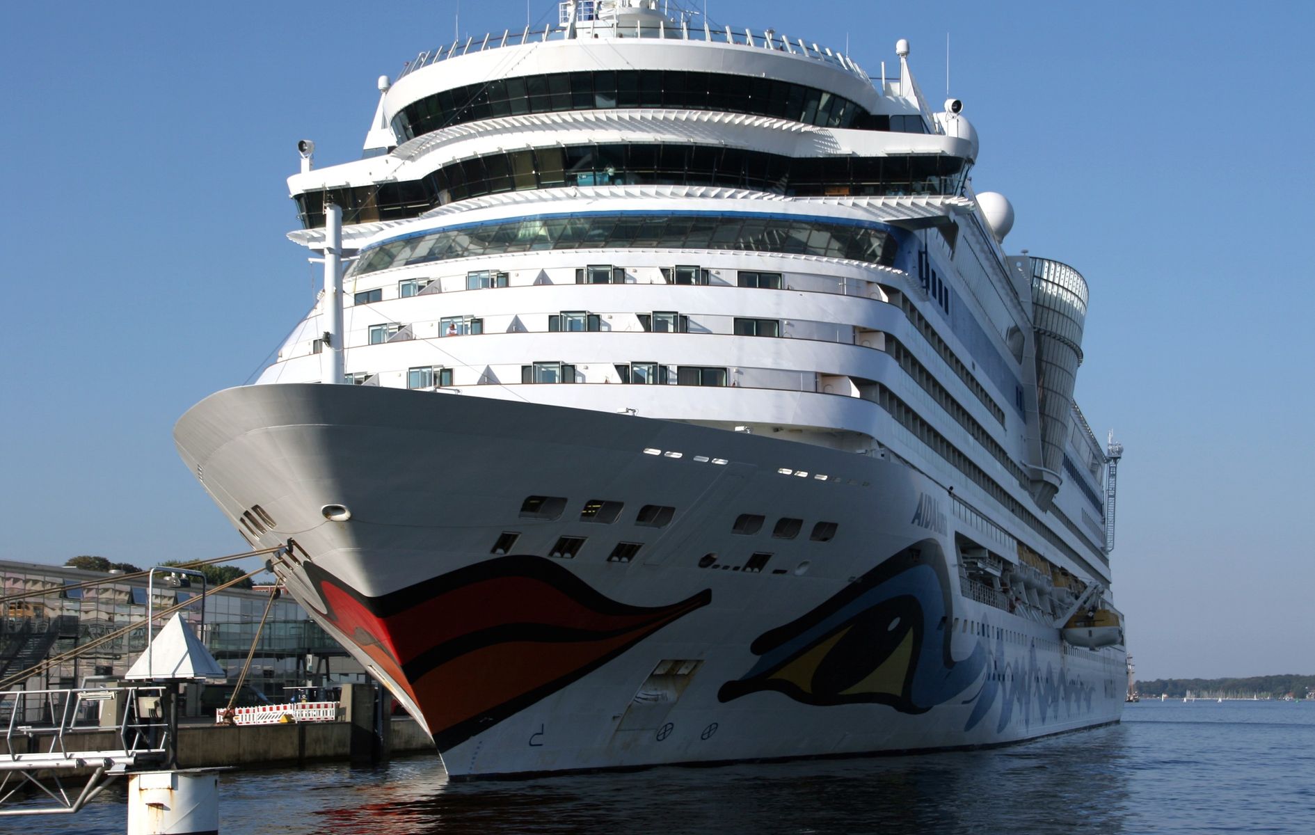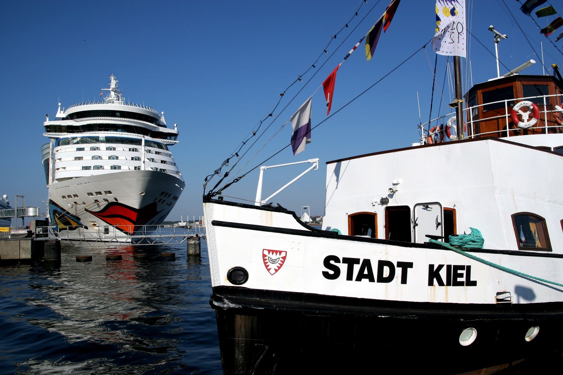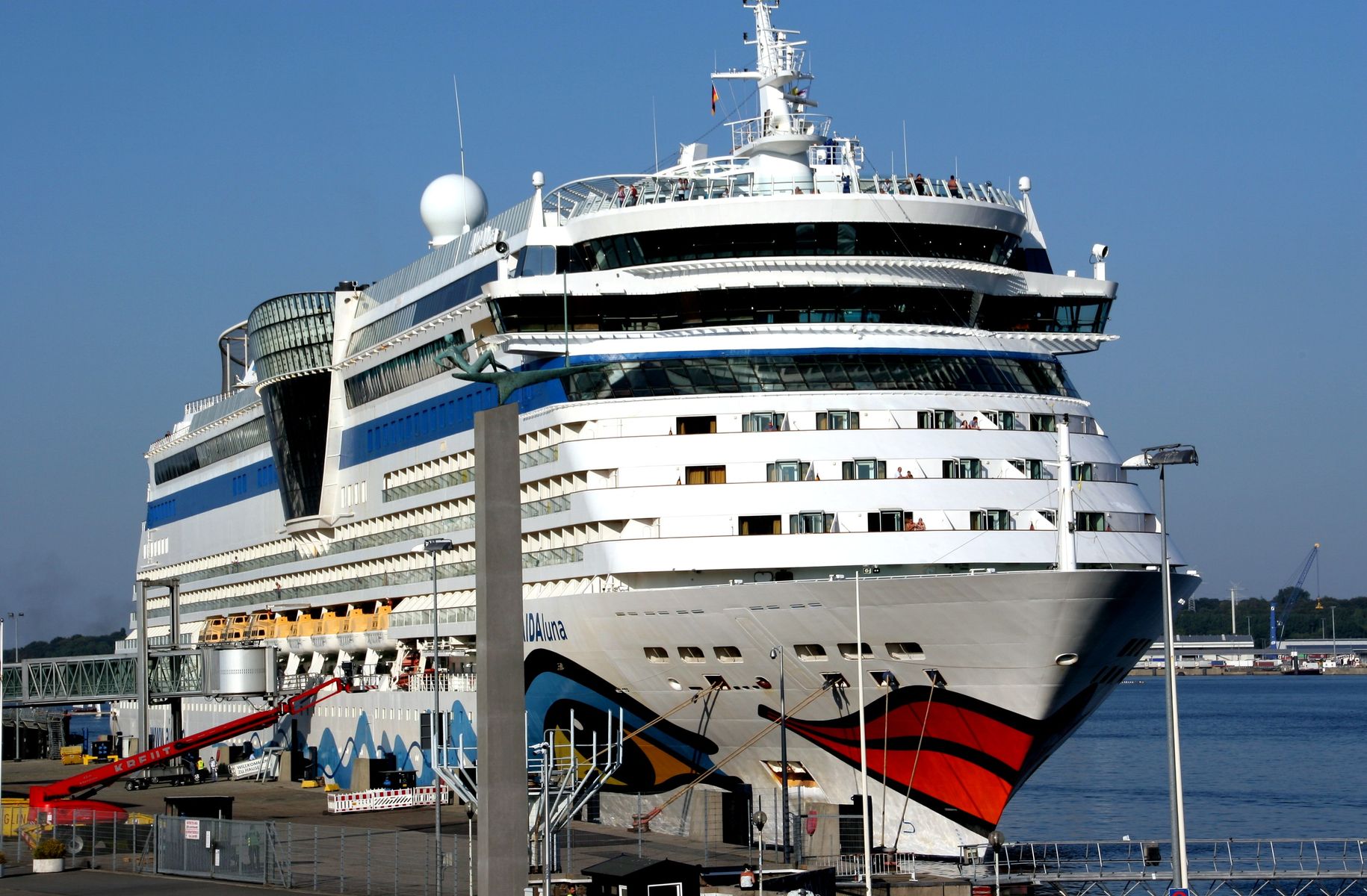 Die AIDAluna unter einem azurblauen Himmel an ihrem "Liegeplatz 27" am Ostseekai in Kiel