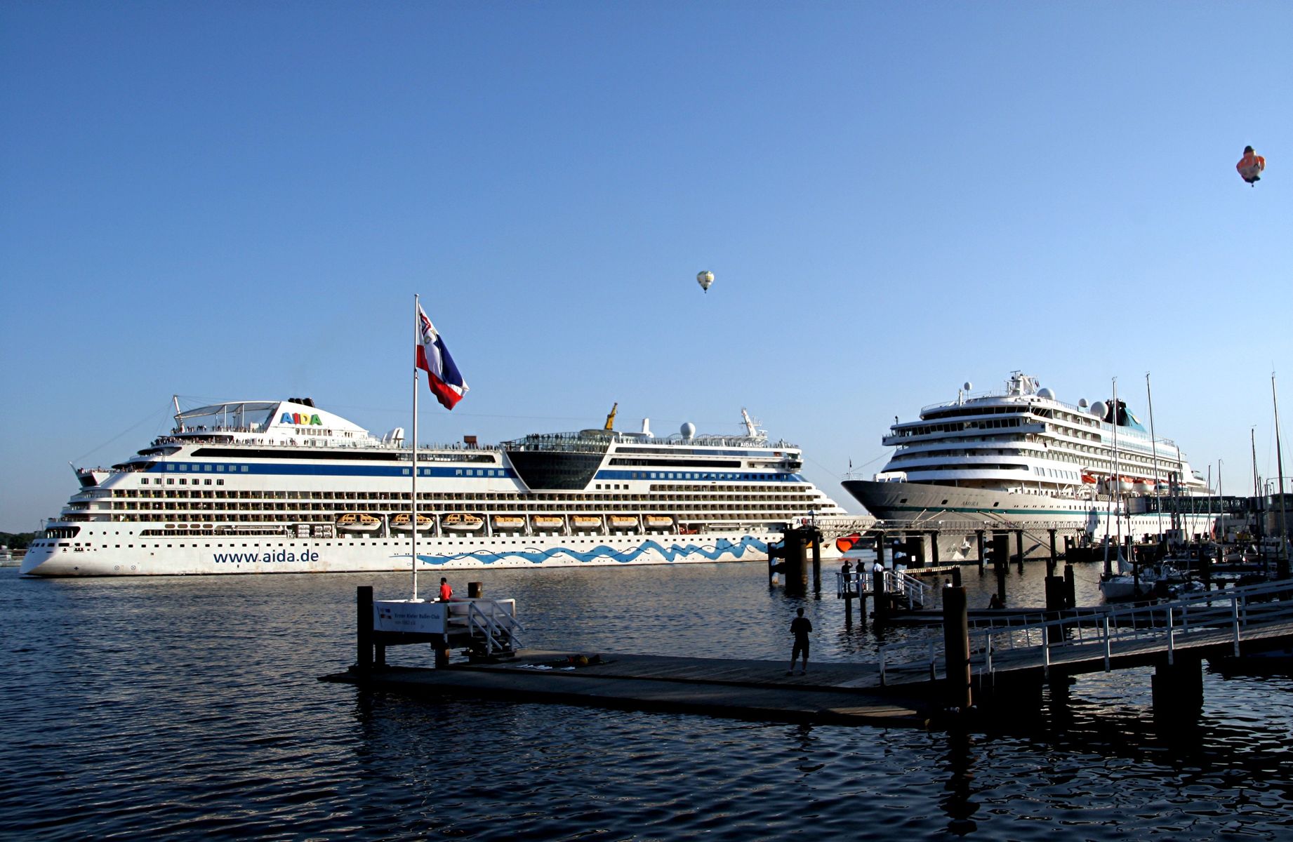 Zwei "Kussmundschiffe" unter einem azurblauen Himmel auf gleicher Höhe während dem Auslaufmanöver der AIDAprima