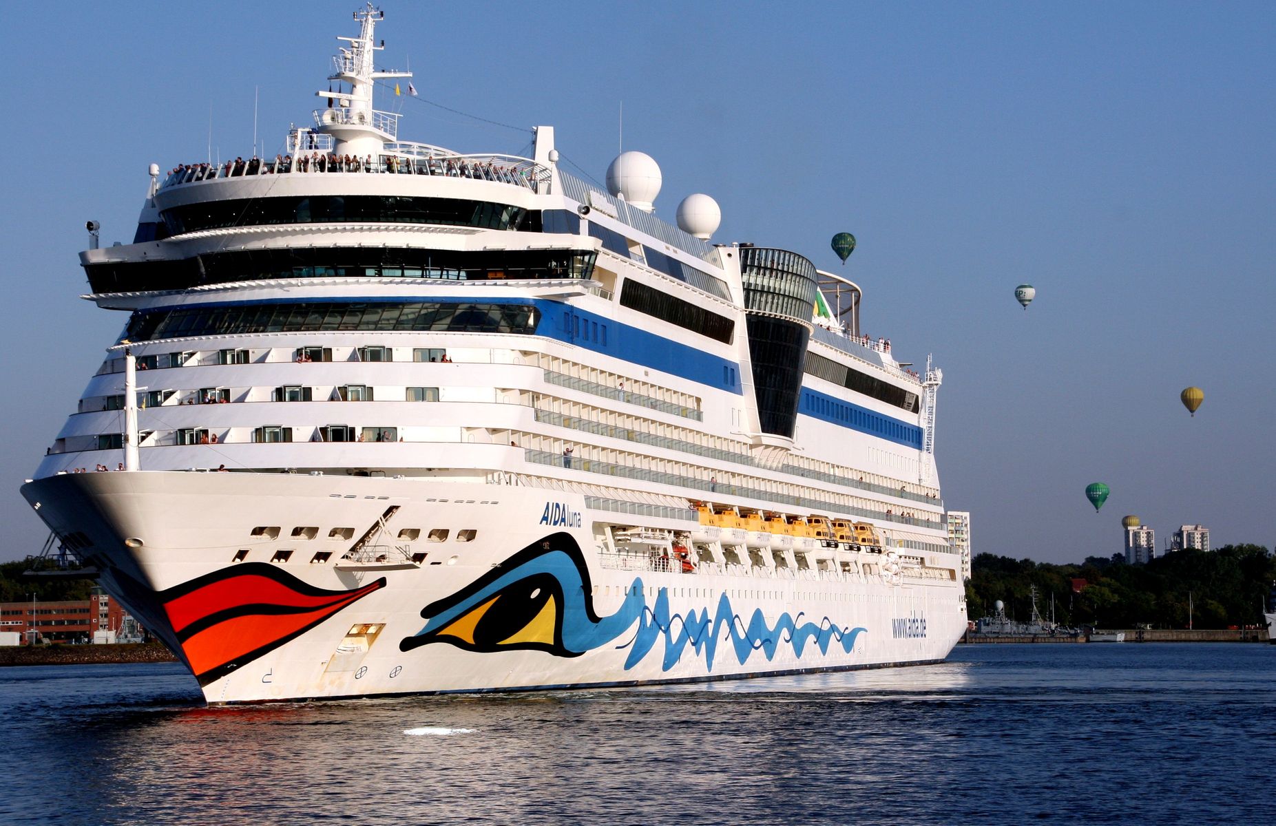 Die AIDAluna dreht unter einem azurblauen Himmel vor der Flaniermeile "Kiellinie" auf dem "Teller"