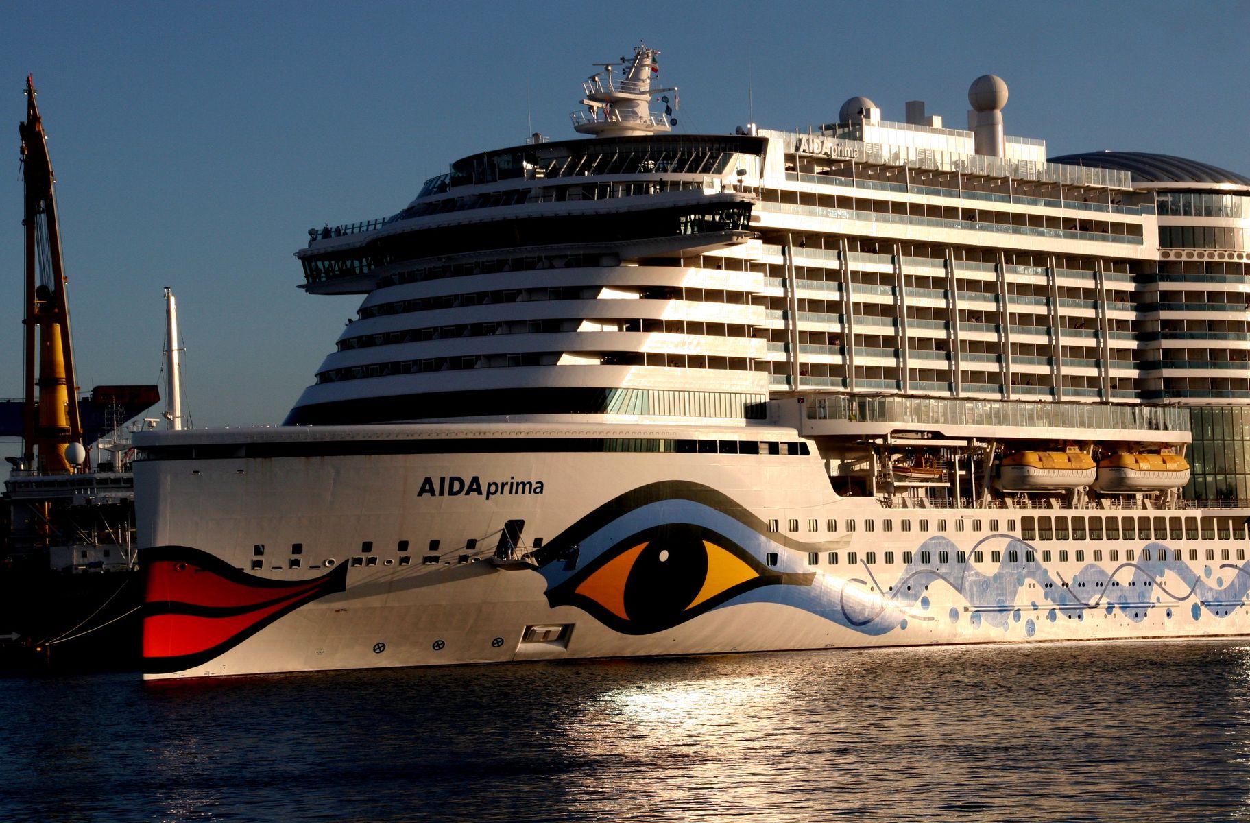 Die AIDAprima unter einem azurblauen Himmel an ihrem "Liegeplatz 27" am Ostseekai
