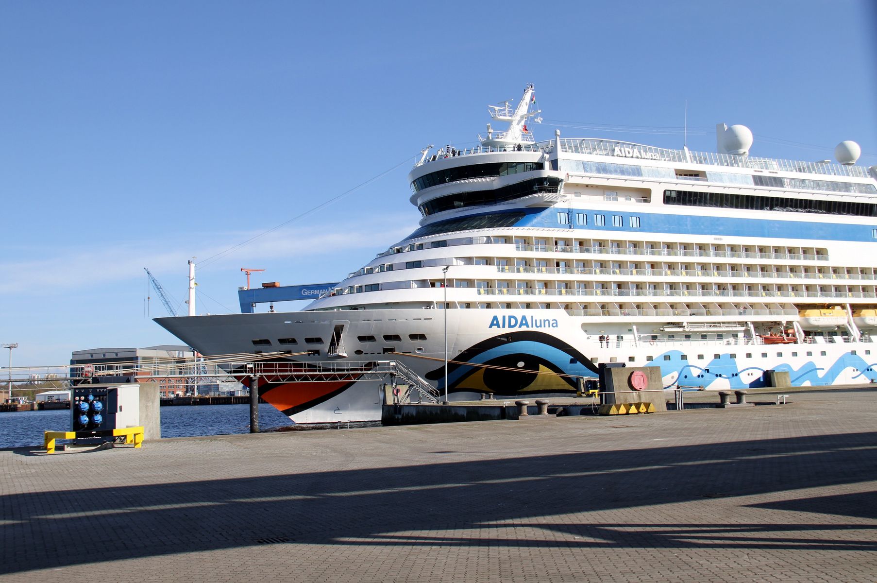 anschließend zu den Bildern vom Einlaufmanöver der AIDAluna am 25.04.2022 habe ich mir die AIDAluna unter einem azurblauen Himmel an ihrem "Liegeplatz 27" am Ostseekai angesehen