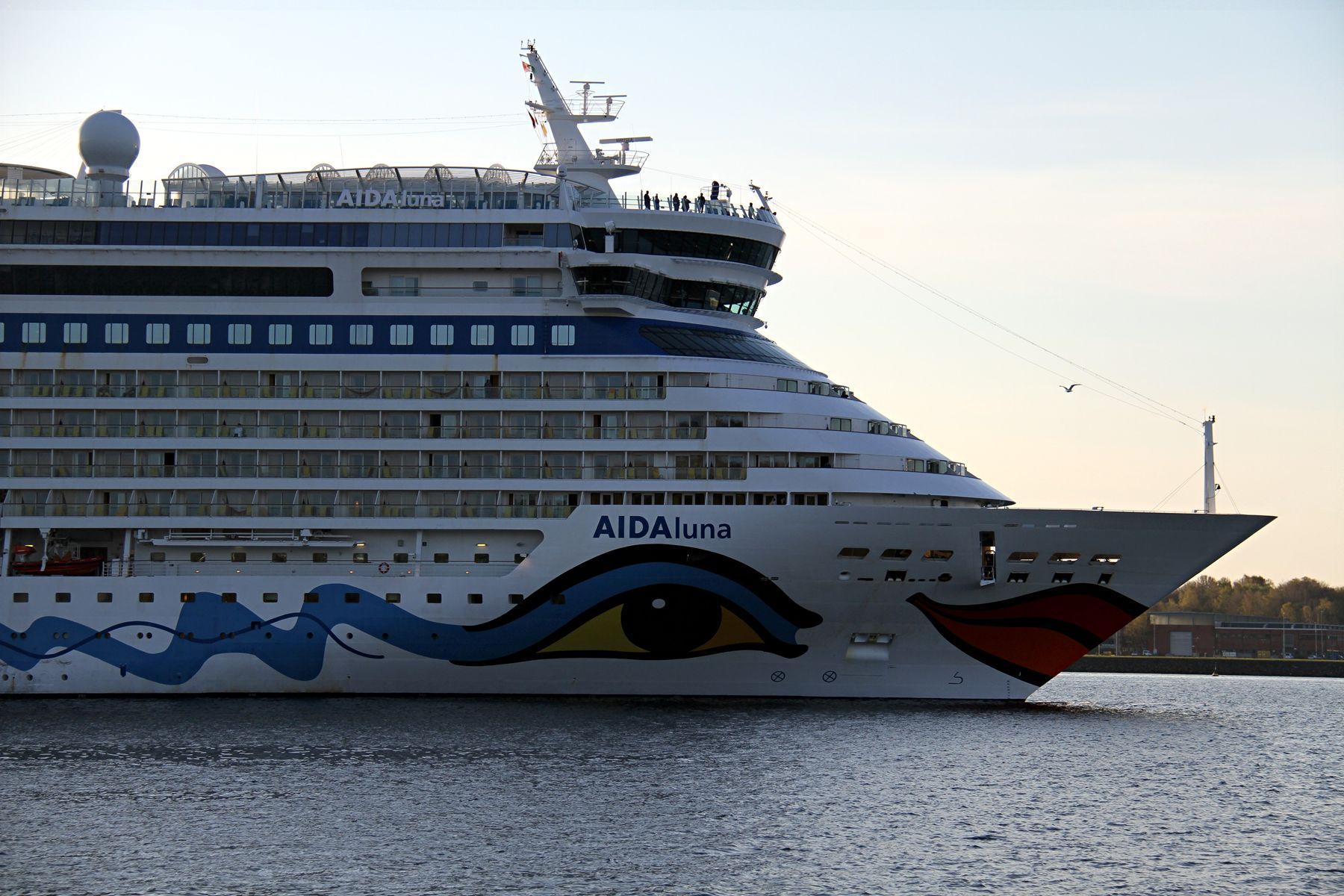 Die AIDAluna fährt um 18:03 h auf der "Kieler Förde" ihr Auslaufmanöver
