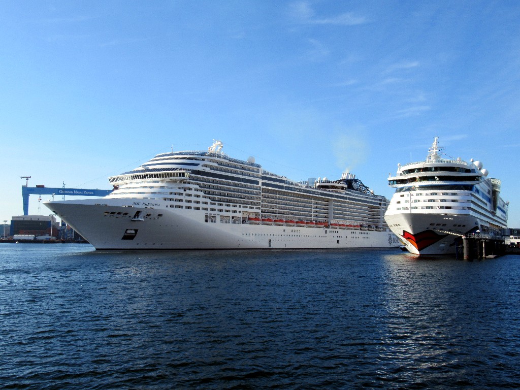 Die MSC Preziosa und die AIDAluna unter einem azurblauen Himmel am Ostseekai in Kiel