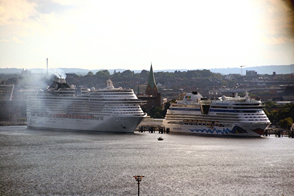 Die MSC Preziosa und die AIDAluna schicken einen kräftigen "Heizergruß" nach Kiel