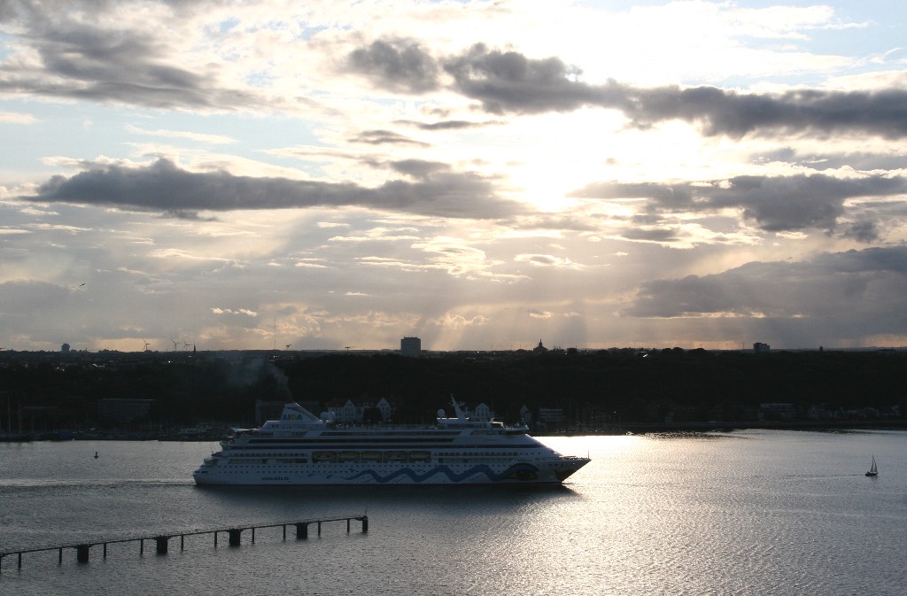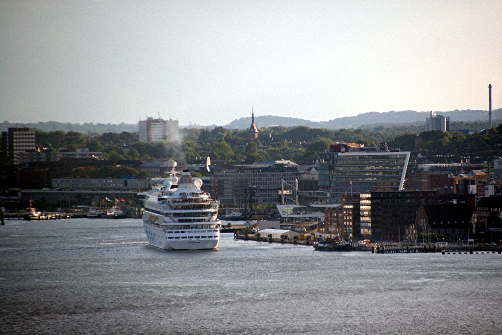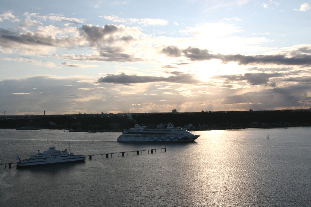 Um 19:03h fährt die AIDAaura mit einer Stunde Verspätung und einem kräftigen "Heizergruß" ihr Auslaufmanöver auf der "Kieler Förde"