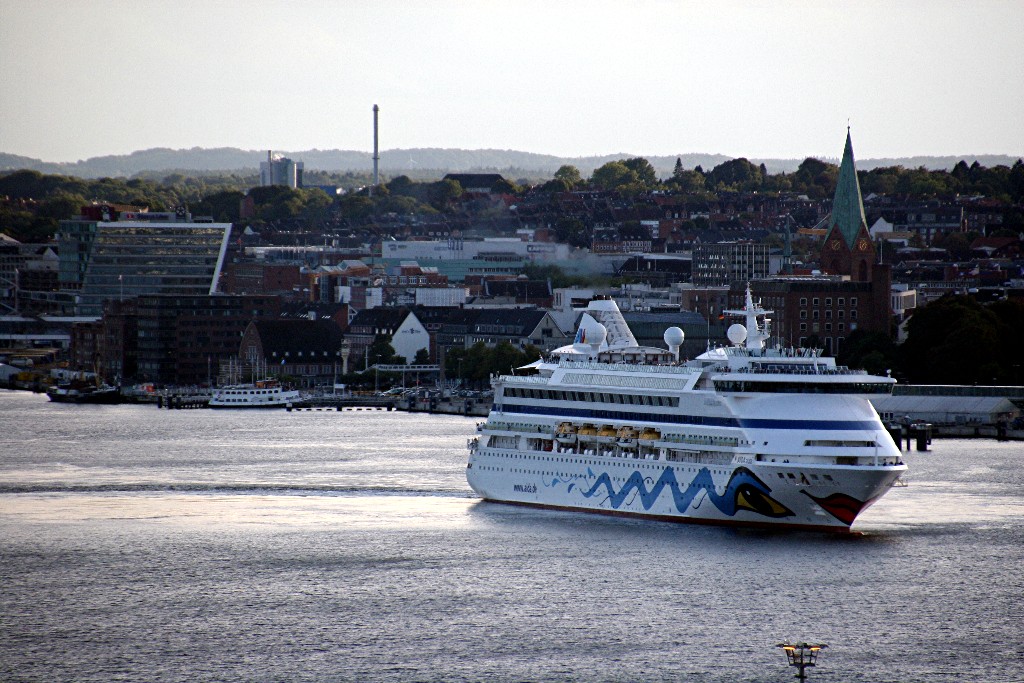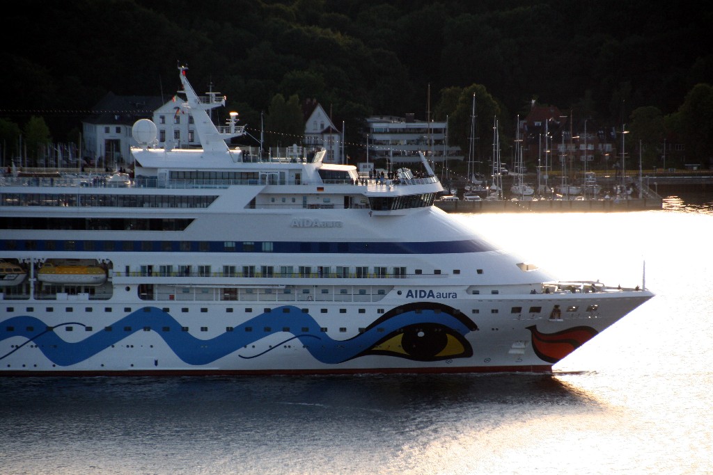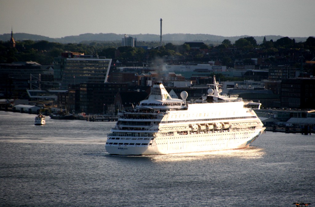 Um 19:03h fährt die AIDAaura mit einer Stunde Verspätung und einem kräftigen "Heizergruß" ihr Auslaufmanöver auf der "Kieler Förde"