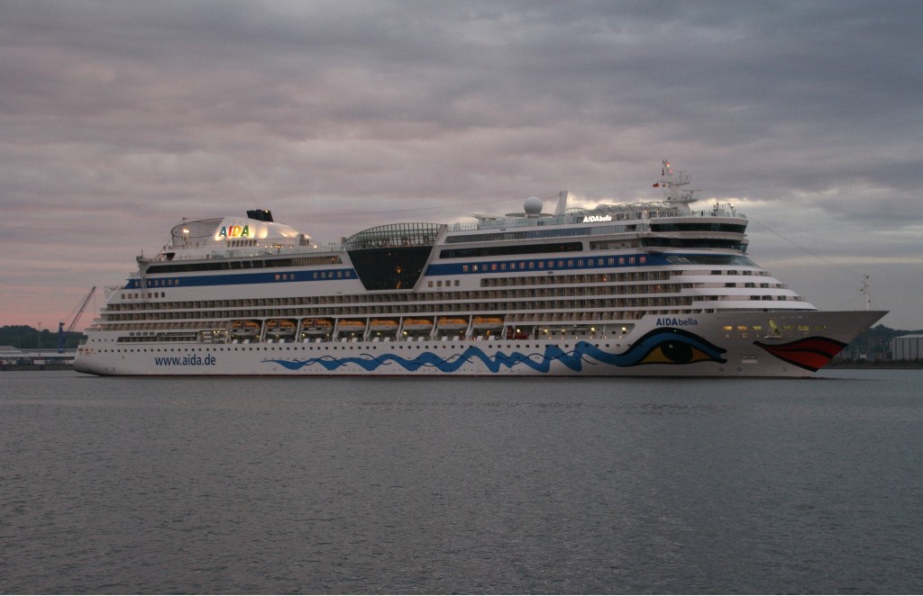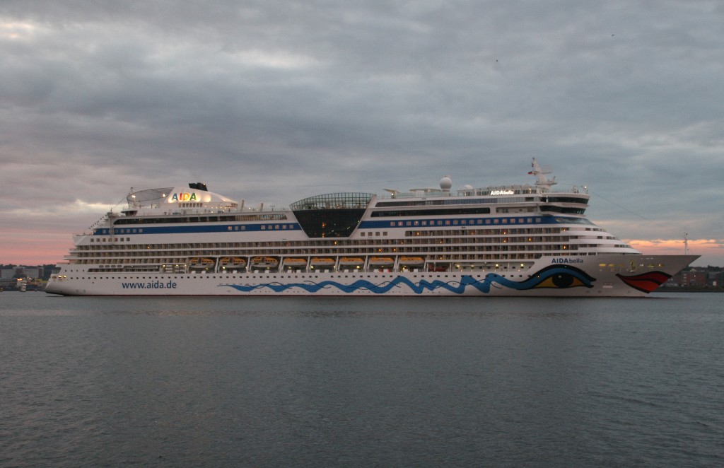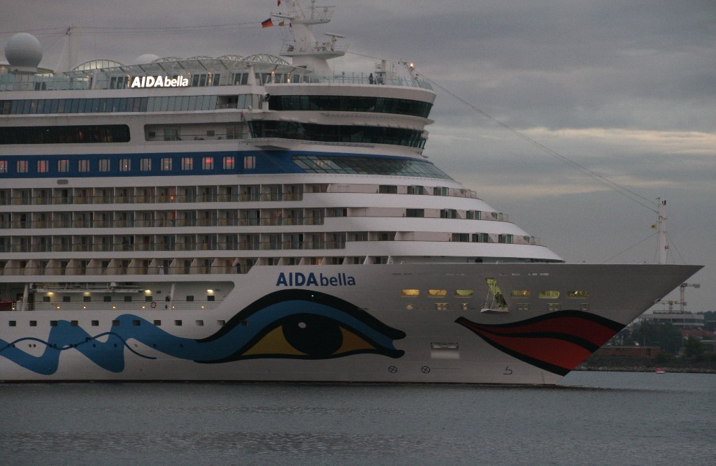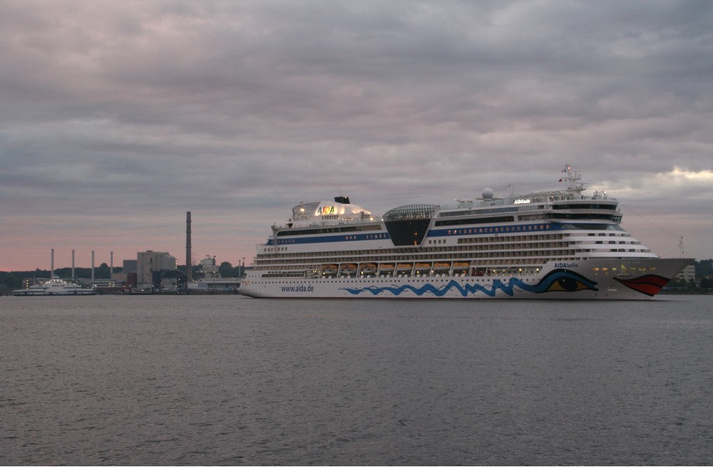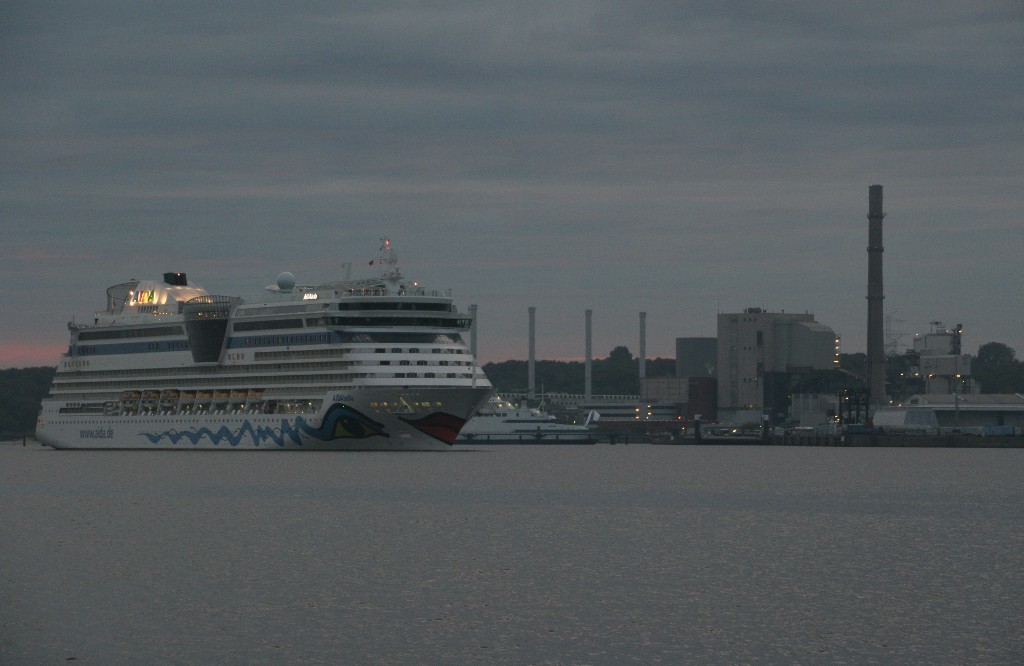 Die AIDAbella während ihrer Revierfahrt um 06:41h auf der "Kieler Förde" (es war noch ganz schön dunkel)