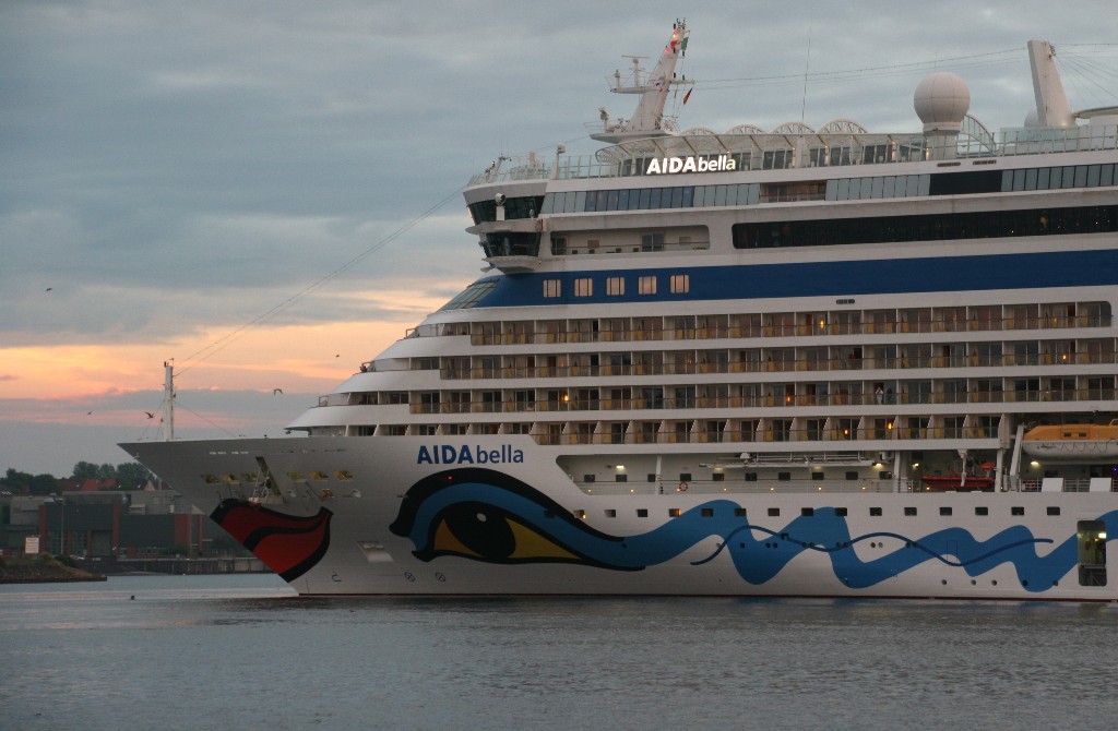 Die AIDAbella fährt in einer stimmungsvollen Atmosphäre rückwärts zum Liegeplatz 27 am Ostseekai