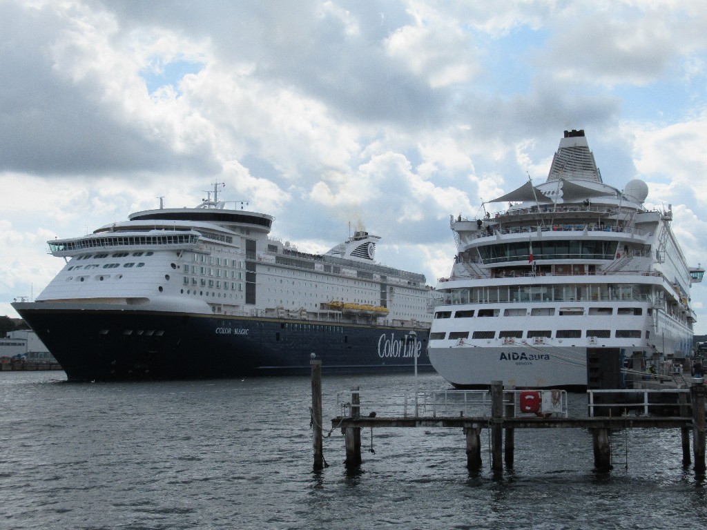 Ein kleiner Fördedampfer zwischen den beiden großen Dampfern