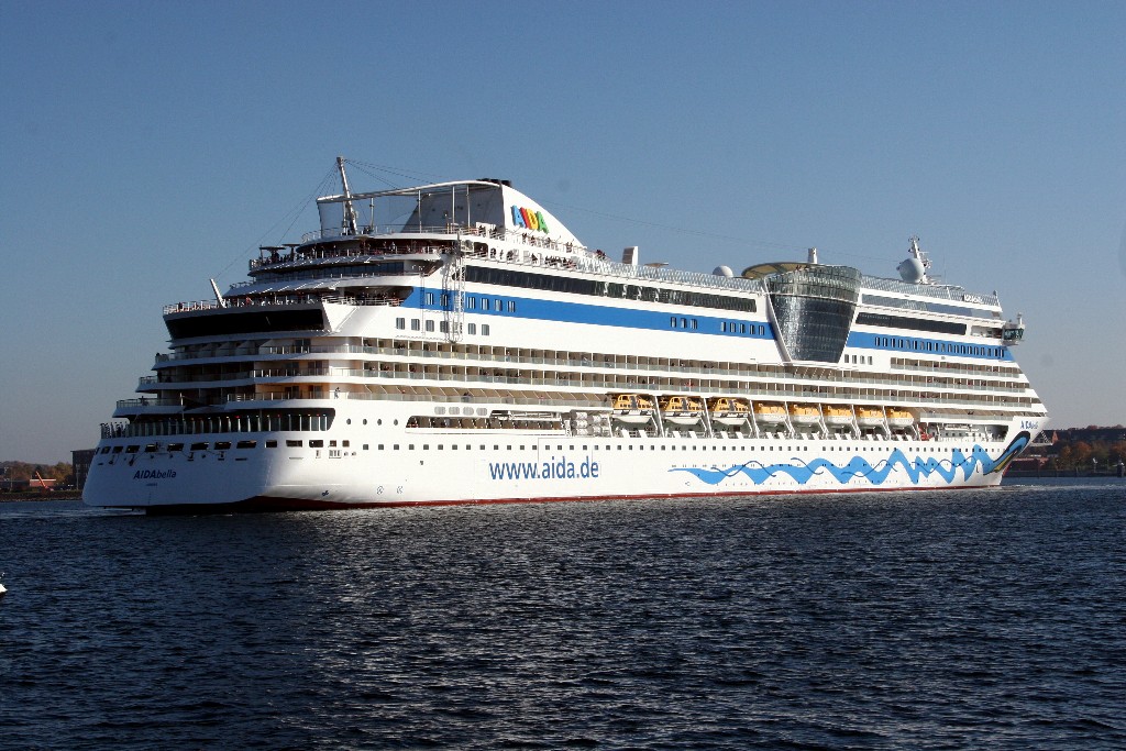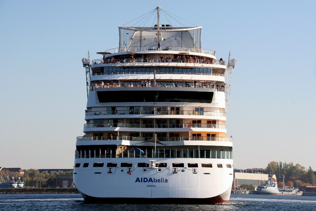Die AIDAbella dreht mit dem Heck zur Flaniermeile "Kiellinie" auf dem "Teller"