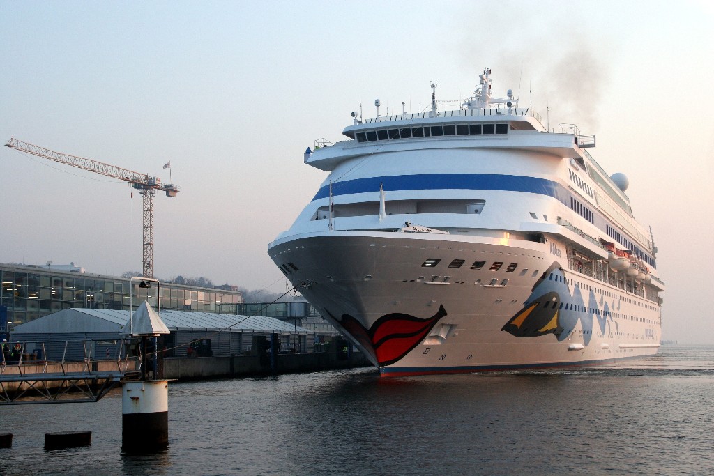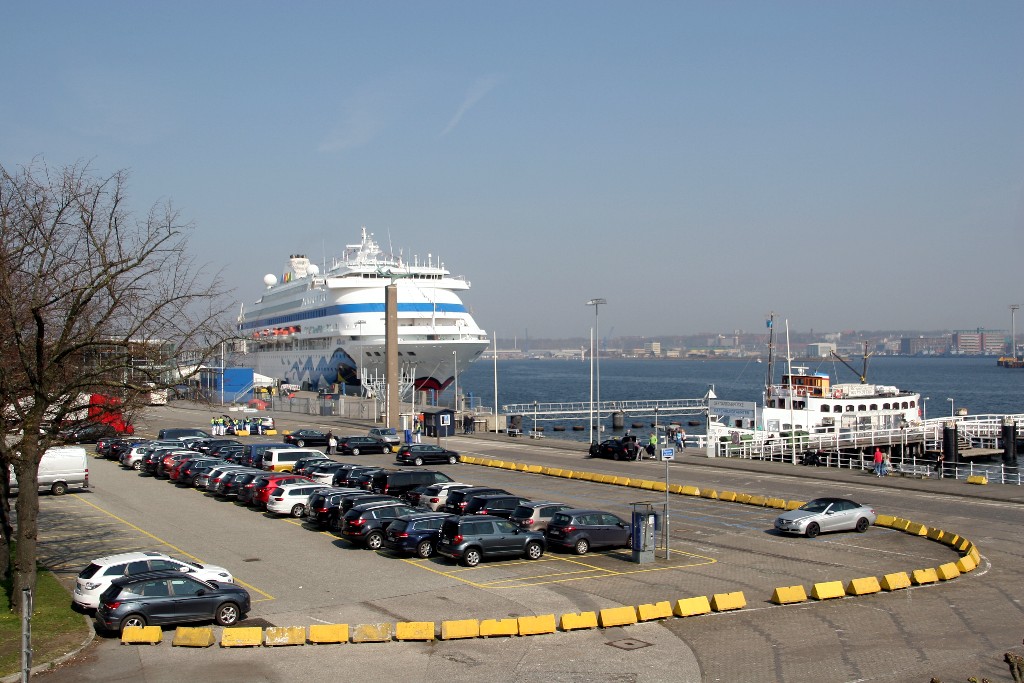 Die AIDAcara dreht vor der Flaniermeile "Kiellinie" auf dem "Teller"