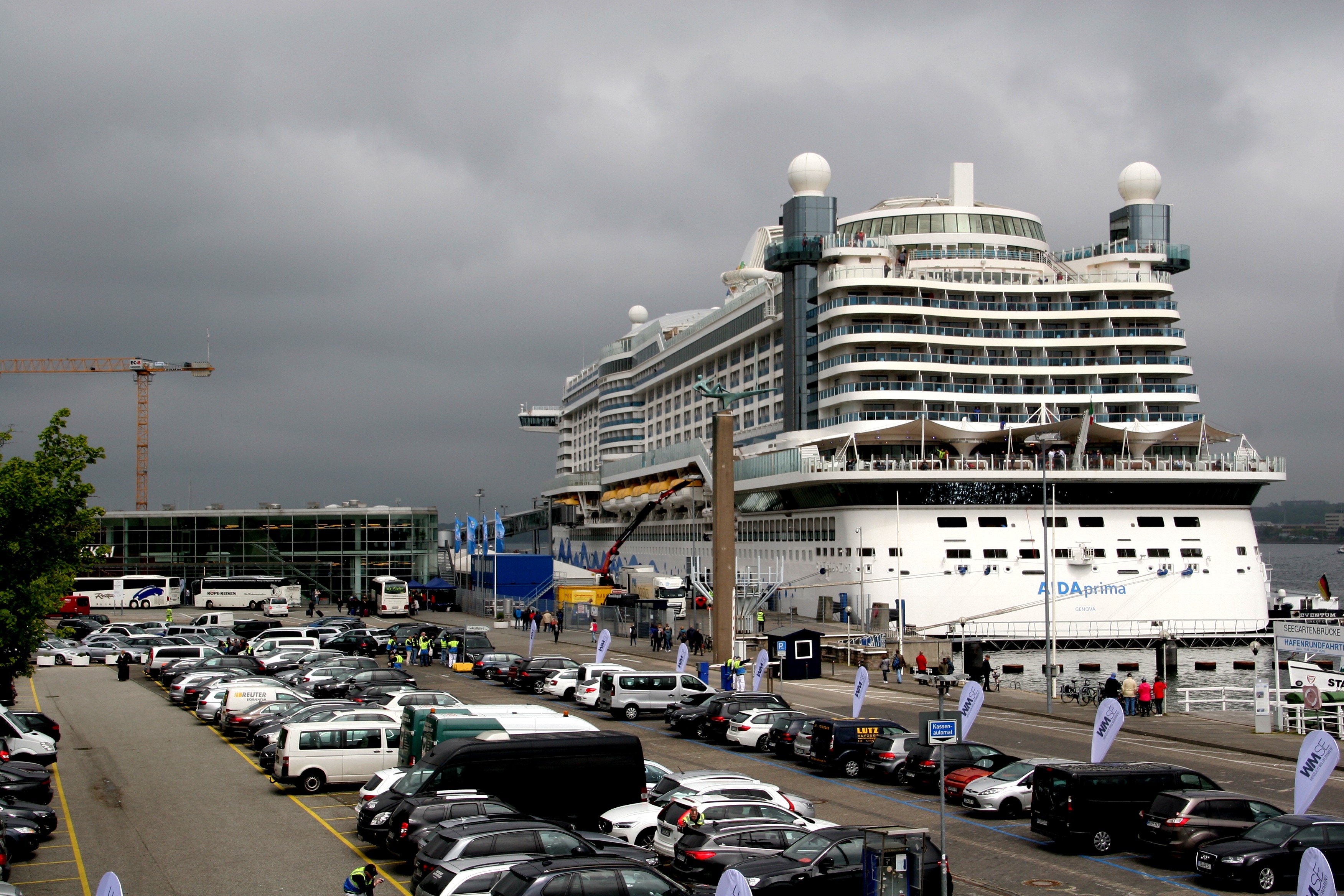 Die AIDAprima liegt unter dunklen Wolken am Ostseekai (LP27) in Kiel