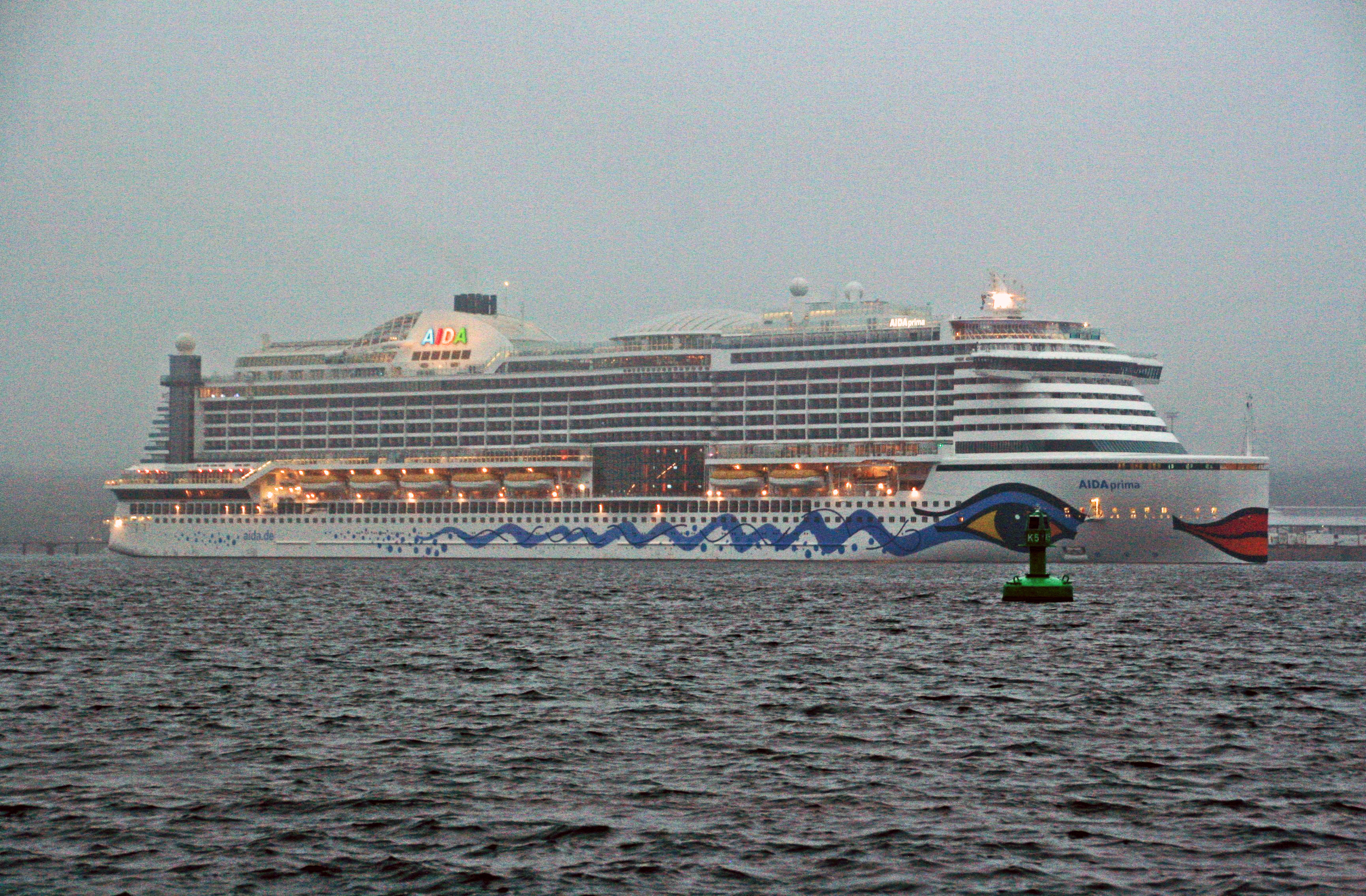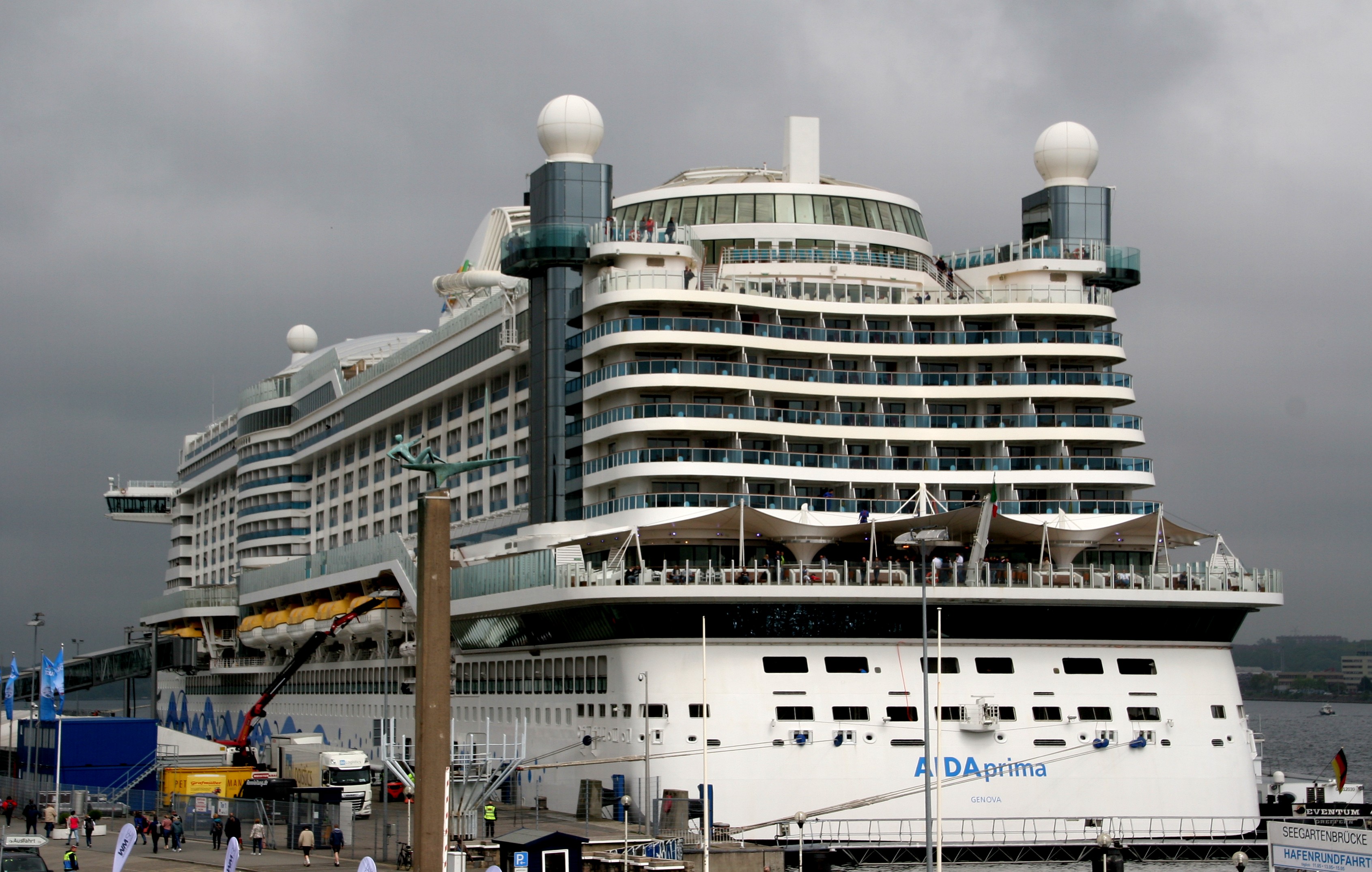 Die AIDAprima liegt unter dunklen Wolken am Ostseekai (LP27) in Kiel