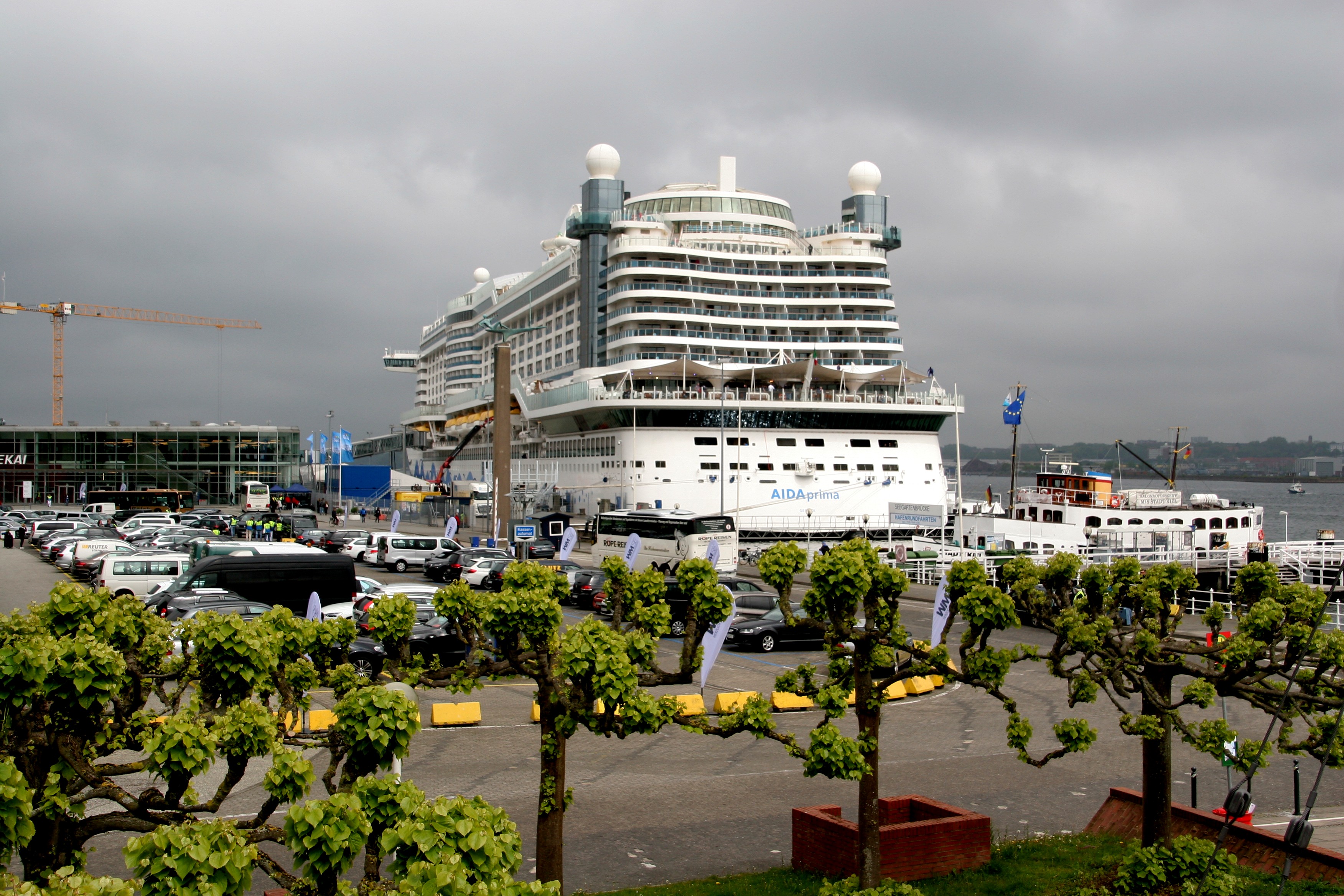 Die AIDAprima liegt unter dunklen Wolken am Ostseekai (LP27) in Kiel