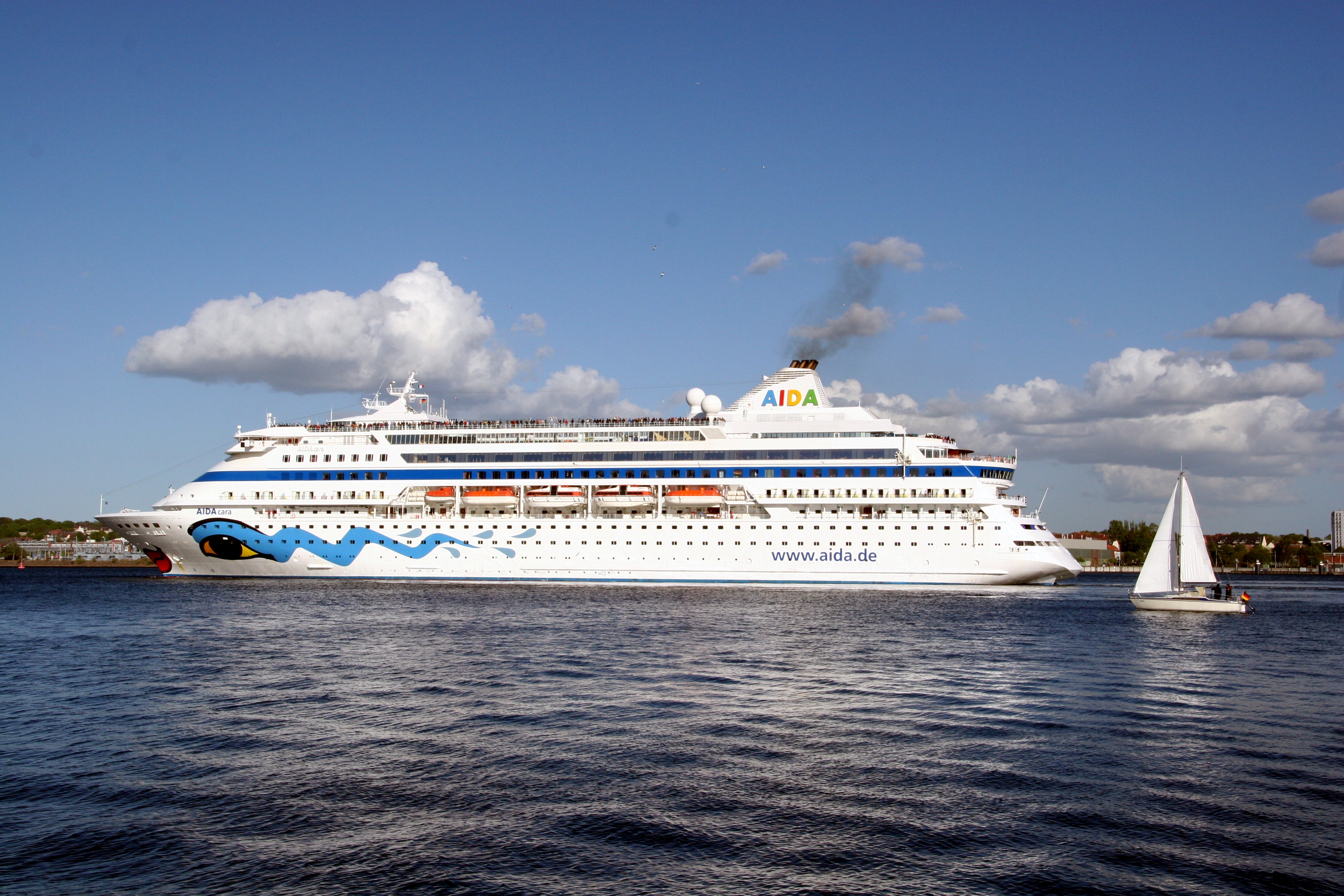 Die AIDAcara fährt ihre "Revierfahrt" auf der "Kieler Förde" unter einem azurblauen Himmel und "Schönwetterwolken"