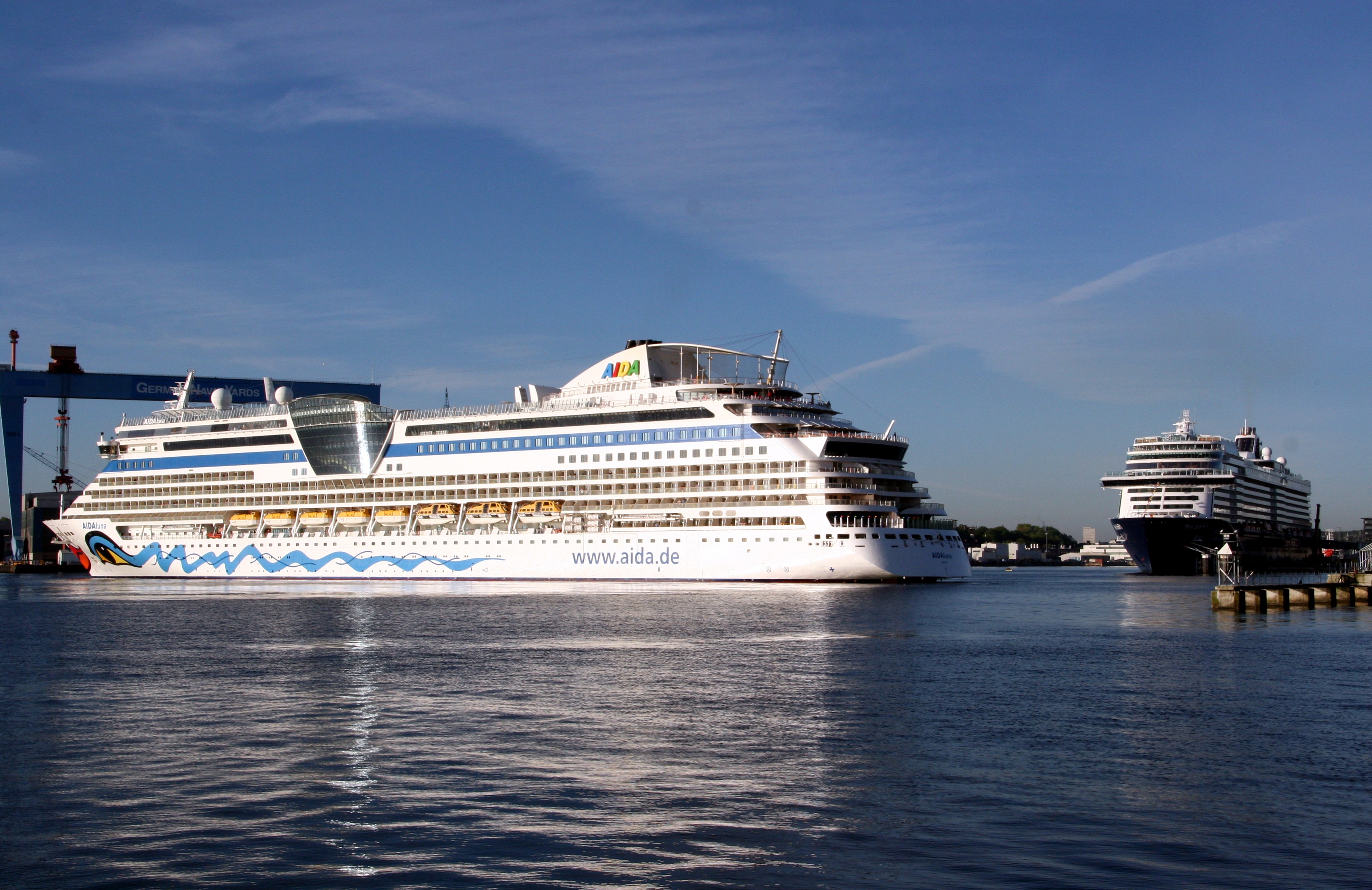Die AIDAluna fährt unter einem azurblauen Himmel vor der "Mein Schiff 1" ihr Anlegemanöver zum Liegeplatz 28 am Ostseekai