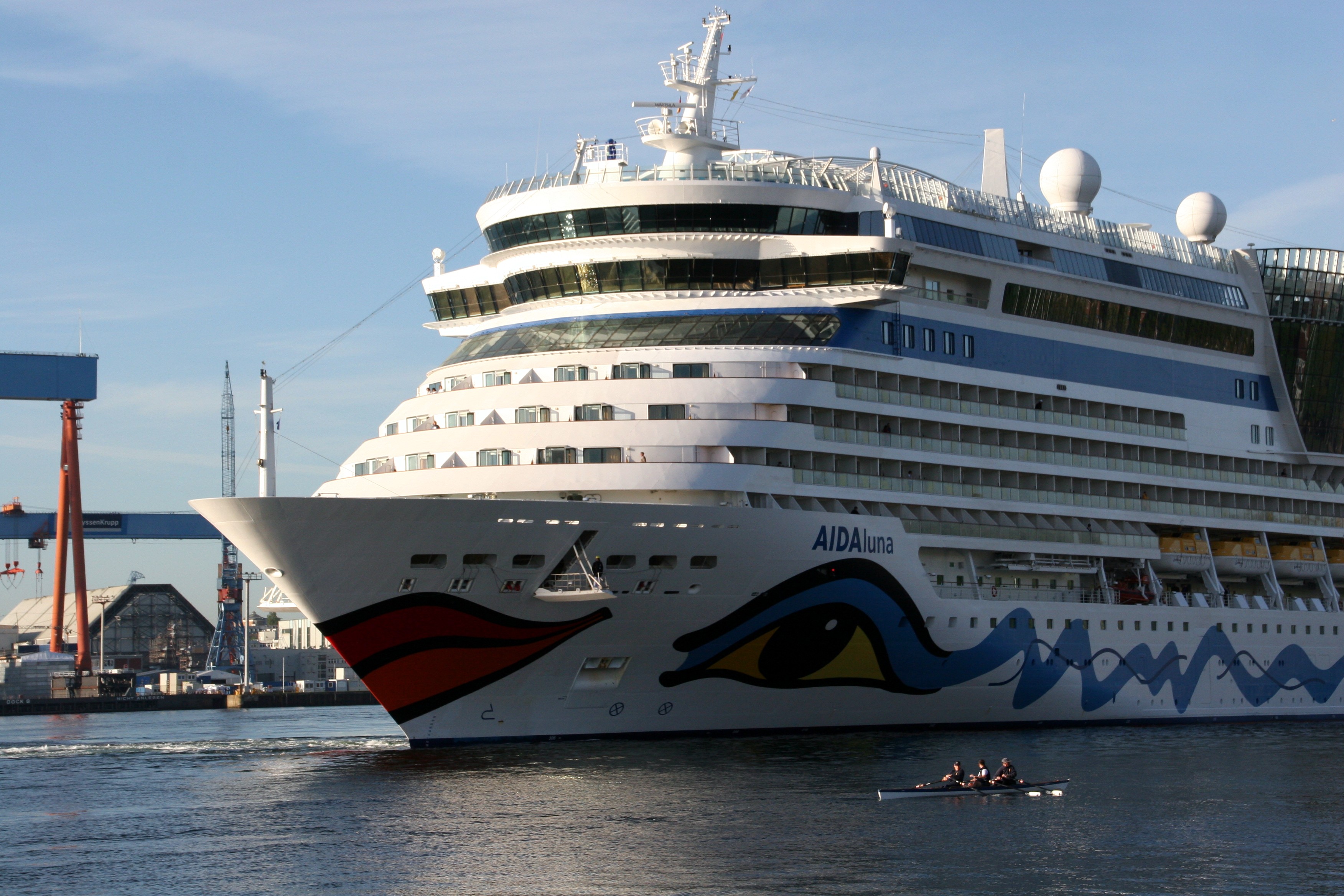 Die AIDAluna dreht morgens unter einem azurblauen Himmel mit dem Heck zur Flaniermeile "Kiellinie" auf dem "Teller"