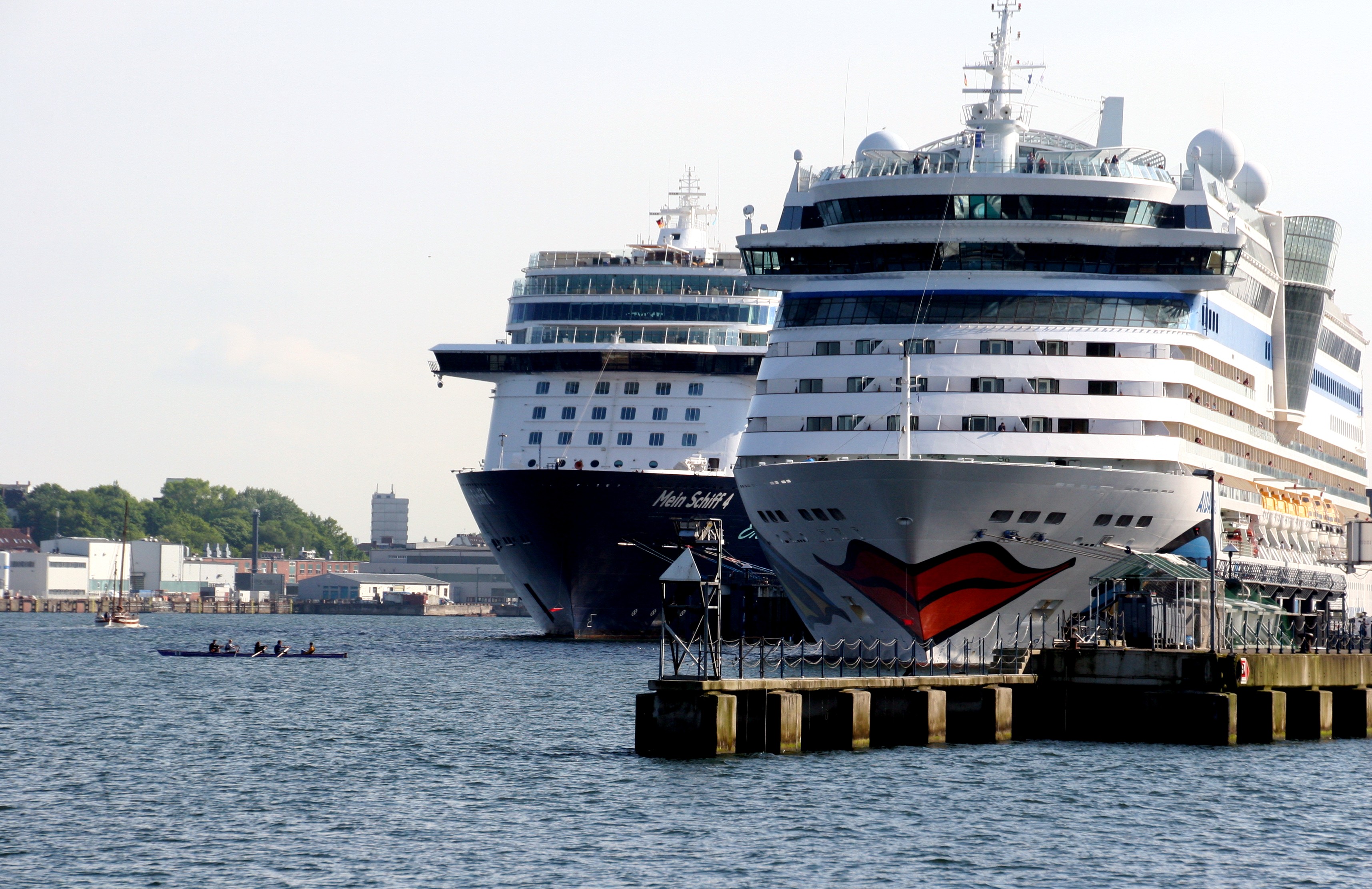 Ein kleiner "Fördedampfer" neben zwei großen "Kreuzfahrtdampfern"